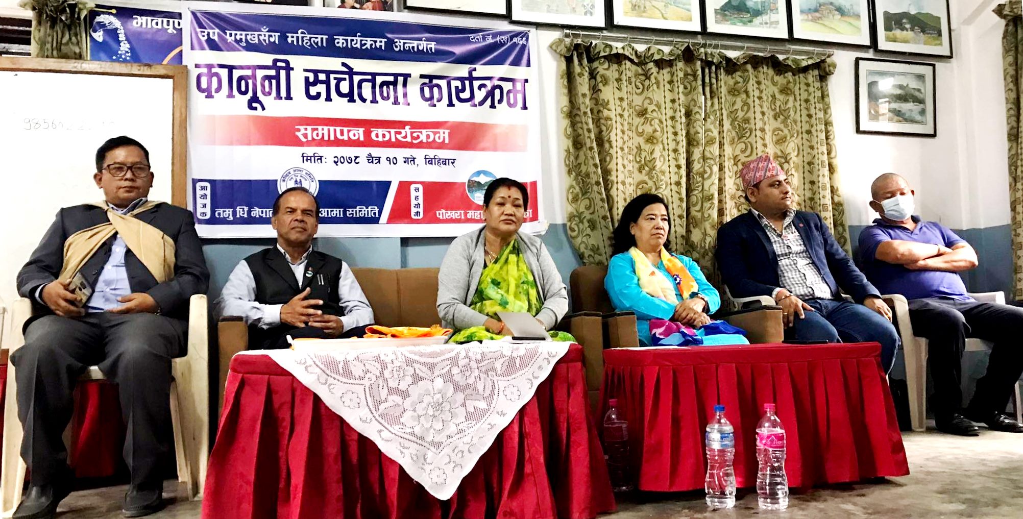 पोखरा,चैत ११ गते ।पोखरा ९ नयाँबजारस्थित तमु धिं नेपालमा पोखरा महानगरपालिकाको सहयोगमा उपमेयरसँग महिला कार्यक्रम अन्र्तगत तीन दिने कानुनी सचेतना कार्यक्रम सम्पन्न भएको छ। तमु धिं नेपाल केन्द्रीय आमा समितिद्धारा आयोजित कार्यक्रम विहिवार सम्पन्न भएको हो।