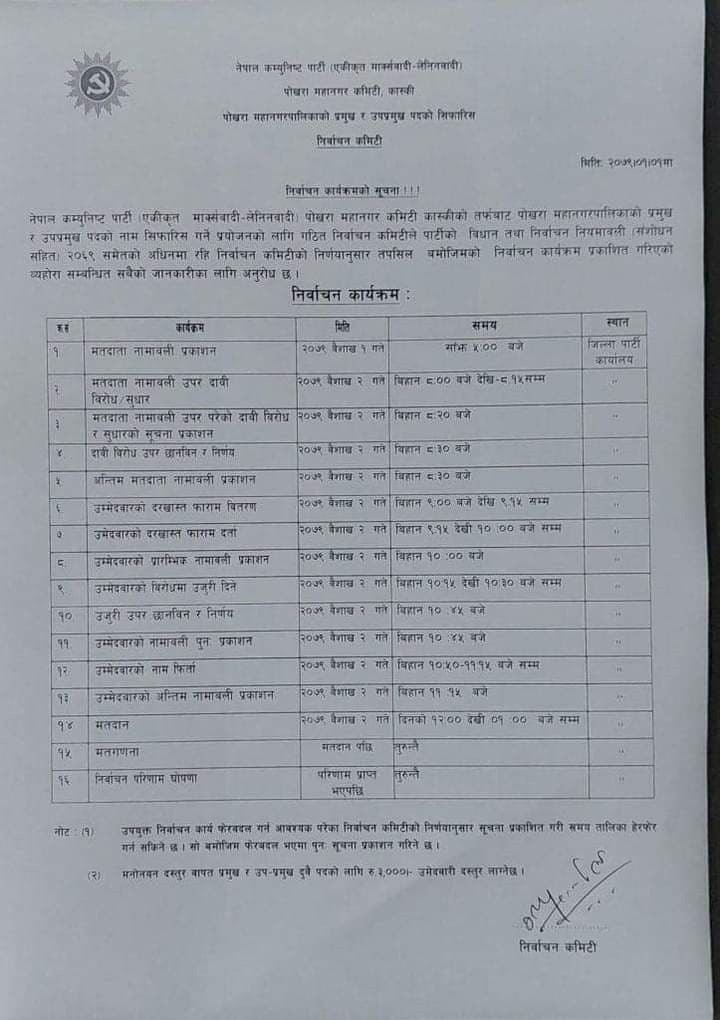 रको अन्तिम नामावली प्रकाशन शुक्रबारै विहान ११ः१५ बजेसम्म र मतदान दिउसो १२ बजेदेखि १ बजेम्मका लागि तय गरिएको निर्वाचन कमिटिले कार्यतालिका सार्वजनीक गरेको छ । मतदानपछि मतणना र परिणाम प्राप्त हुने वित्तिकै मत परिणाम घोषणा गरिने भएको छ ।पोखराका मेयरमा १२ र उपमेयरमा ११ जनाले आकाक्षा ब्यक्त गरेका छन् ।