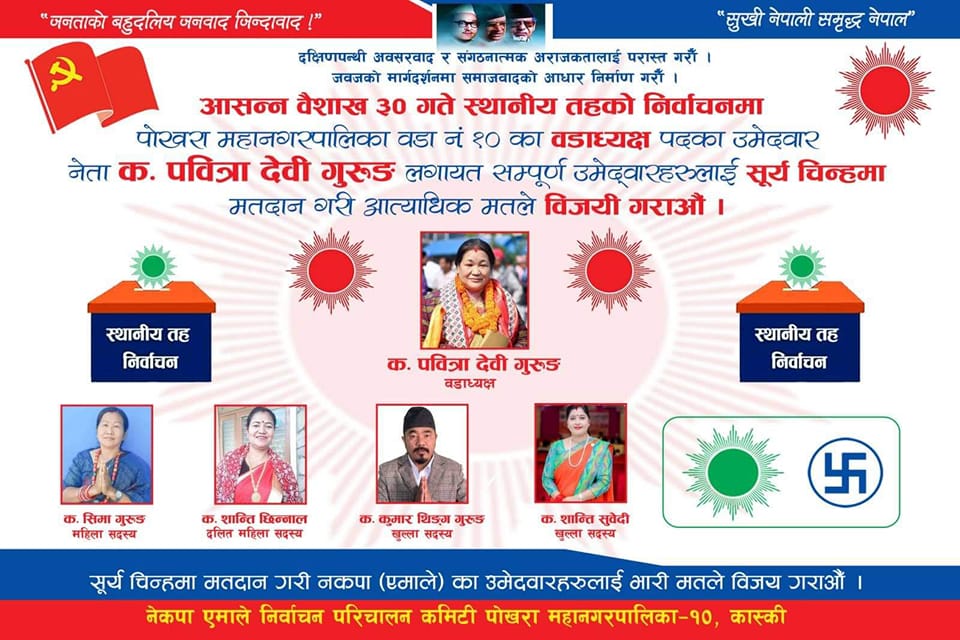 पोखरा १० बाट नेकपा एमालेबाट अध्यक्षमा पवित्रा देवी गुरुङ, सदस्यहरुमा सदस्यहरुमा कुमार थिङ तामाङ, सीमा गुरुङ, शान्ति सुवेदी र दलित महिला सदस्यमा शान्ती परियार उमेदवार रहेका छन ।