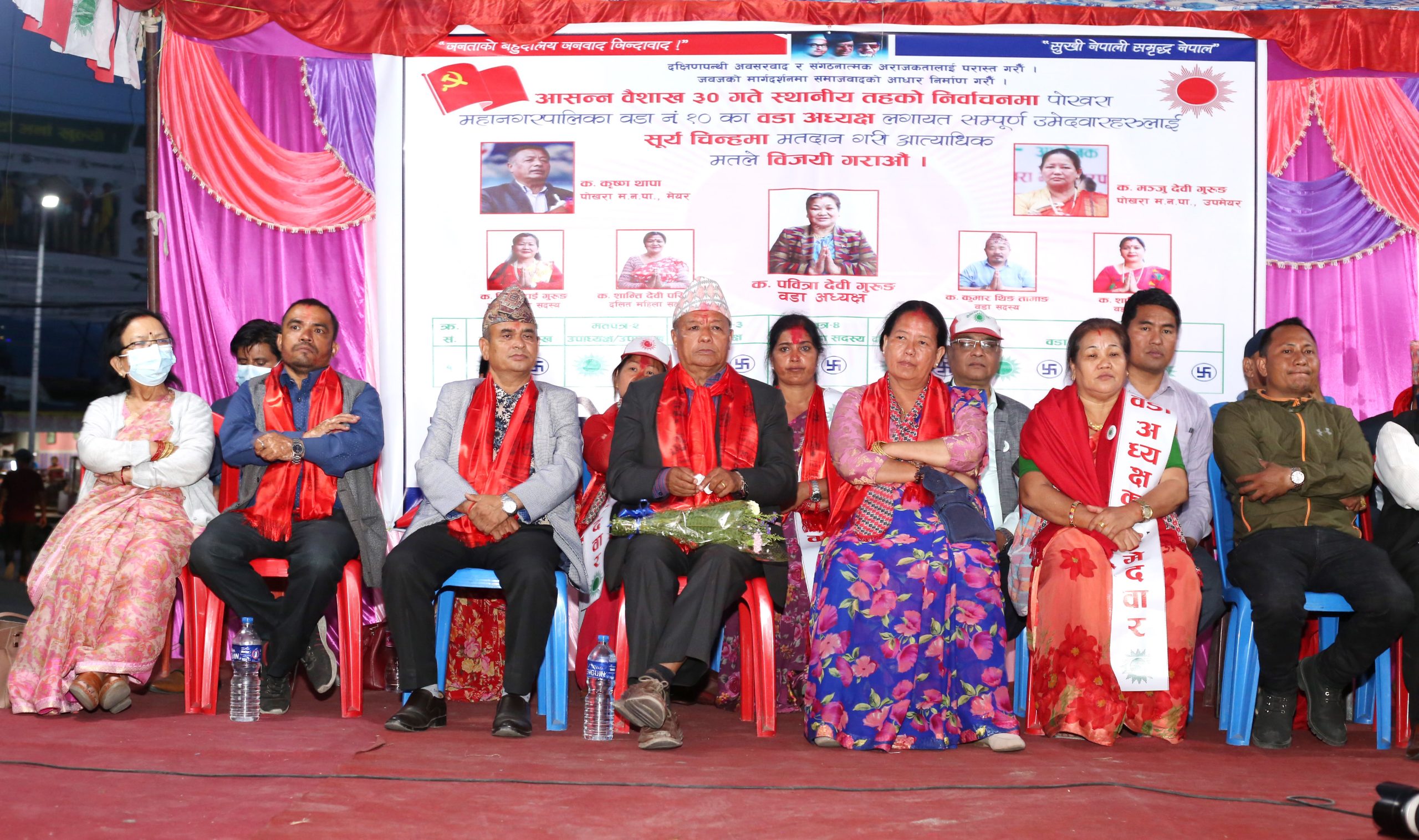 पोखराको समृद्ध बिकासका लागी एमालेका उमेदवारहरुले प्रतिवद्धता जाहेर गरेका कुरालाई लागु गर्दै जनताको सेवामा लाग्नका लागी लाग्न समेत उनले आग्रह गरेका थिए । त्यस्तै पोखरा महानगरपालिका मेयर पदका उमेदवार कृष्ण बहादुर थापाले २०४९ सालदेखि अन्य पार्टीले वडा चलाईरहेको पोखरा १० भित्रको बिकासलाई हेर्न आग्रह गर्दै यदि वडाको बिकास गर्नेहोभने महिला नेतृत्वलाई मत दिन मतदातालाई आग्रह गरे ।
