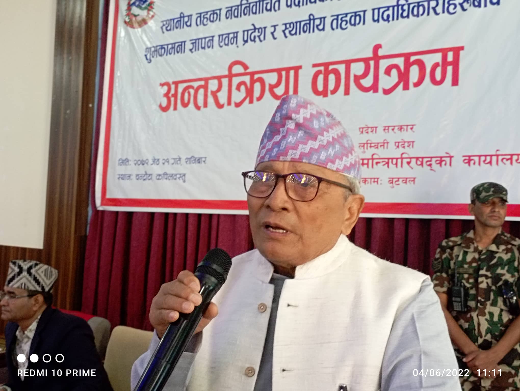 उहाँले राज्यका हरेक निकायमा जनताको सहभागीता र पहुँच पु¥याउनको लागि सबैले सबैले ध्यान दिनुपर्ने बताउँदै जनताको हरेक विकास निर्माणलाई ध्यान दिएर अगाडी बढ्नका लागि अनुरोध गर्नुभयो ।कार्यक्रममा लुम्बिनी प्रदेश सभाका सभामुख पुर्णबहादुर घर्तीले जनताको जीवन स्तरमा आमूल परिवर्तनका लागि अगाडी बढ्नका लागि अनुरोध गर्दै जनताको प्रतिनिधीले सधै जनताप्रति उत्तदायित्वलाई पूरा गर्नका लागि अगाडी बढ्न अनुरोध गर्नभभयो ।