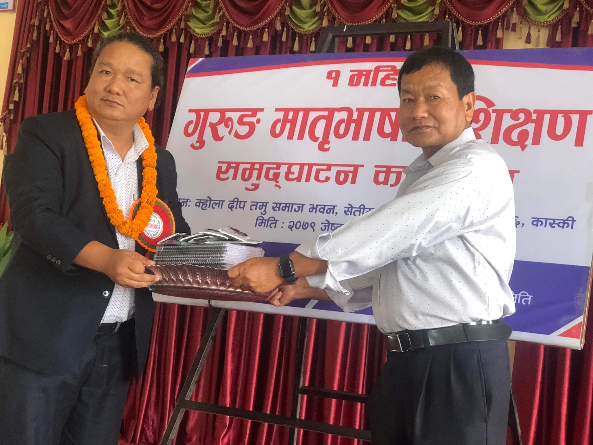 तमु प्ये ल्हु संघ केन्द्रीय समितिका अध्यक्ष हितकाजी गुरुङको अध्यक्षतामा आयोजित कार्यक्रममा गण्डकी प्रज्ञा प्रतिष्ठानका उपकुलपति गोरे गुरुङ, सदस्य सचिव मनकुमार श्रेष्ठ, प्राज्ञ कृष्ण प्रसाद पौडेल, तमु प्ये ल्हु संघ कास्कीका अध्यक्ष निम बहादुर गुरुङ, ओम बहादुर गुरुङ, हर्क गुरुङ लगायतले मातृभाषा प्रशिक्षण कार्यक्रमको आवश्यकताको बारेमा बोल्नुभएको थियो ।
