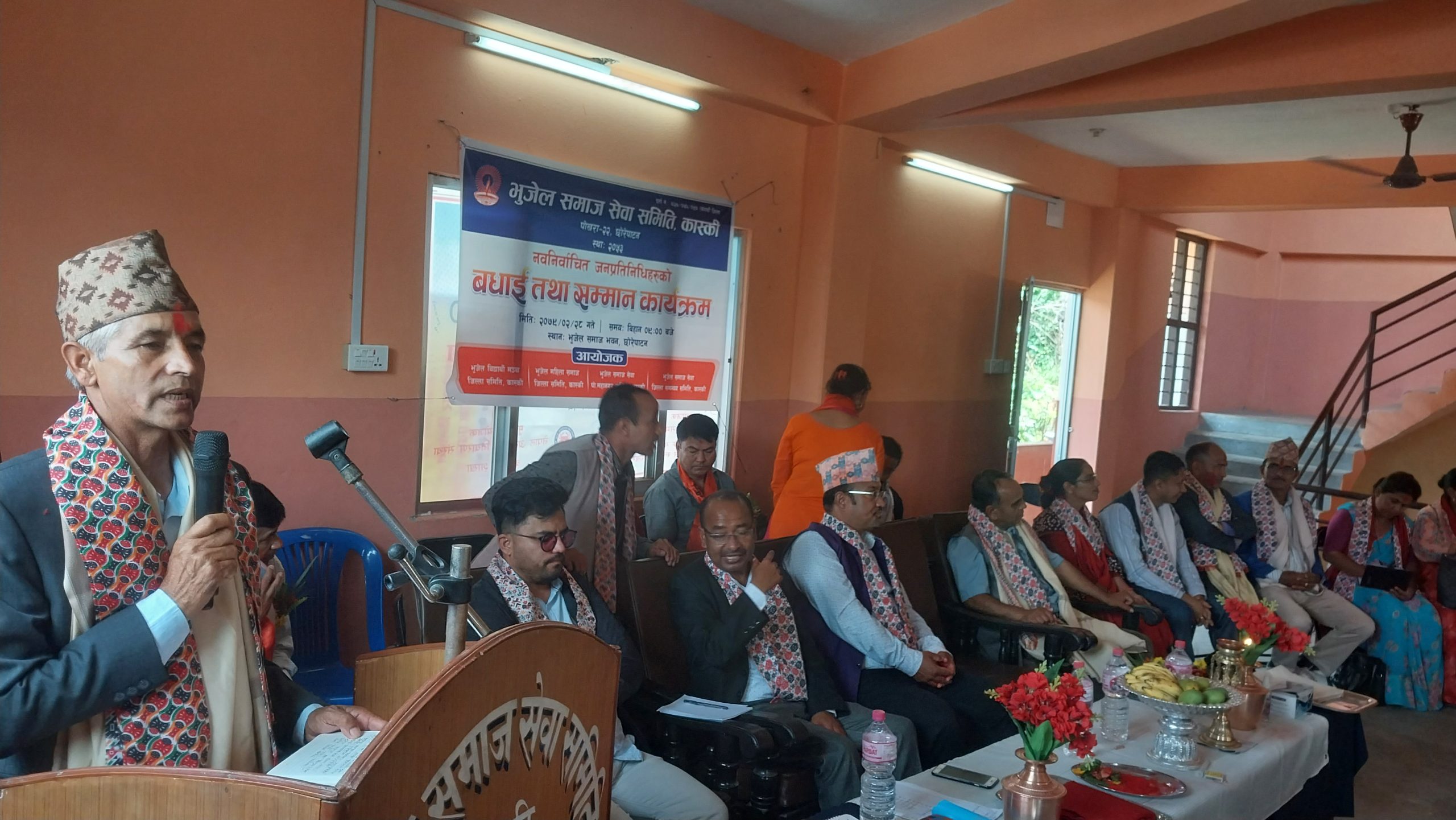 पोखरा ,जेठ २८/भुजेल समाज सेवा समिति कास्कीले स्थानीय तह निर्बाचन २०७९ का कास्कीबाट नवनिर्बाचित जनप्रतिनिधिहरुलाइ बधाई तथा सम्मान कार्यक्रम सनिबार सम्पन्न गरेको छ ।पोखरा महानगरपालिका वडा न २२ स्थित आफ्नै कार्यालयमा आयोजित बिशेस कार्यक्रमको आयोजना गरि कास्की जिल्लाका बिभिन्न पालिकामा निर्बाचित पदाधिकारी तथा सदस्यमा निर्बाचित आफ्ना सदस्यहरुलाई सम्मान गरिएको सो समाजले जनाएको छ ।