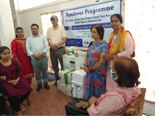 पोखरा, असार ३२ गते ।पोखरा महानगरपालिका वडा नम्वर १ शंकर टोल स्थित पोखरा व्यवसायिक महिला क्लबले दृष्टिविहिन विद्यार्थीहरुका लागि आवश्यक शैक्षिक सामग्री सहयोग गरेको छ ।क्लबले पोखराको पृथ्वीनारायण क्याम्पस स्थित दृष्टिविहिन विद्यार्थीहरुले अध्ययन गर्ने अडियो पुस्तकालयलाई स्क्यानर, लेजर प्रिन्ट, ब्रेल पेपर सगै आवश्यक स्टेशनरी सामग्री सहयोग गरेको हो ।