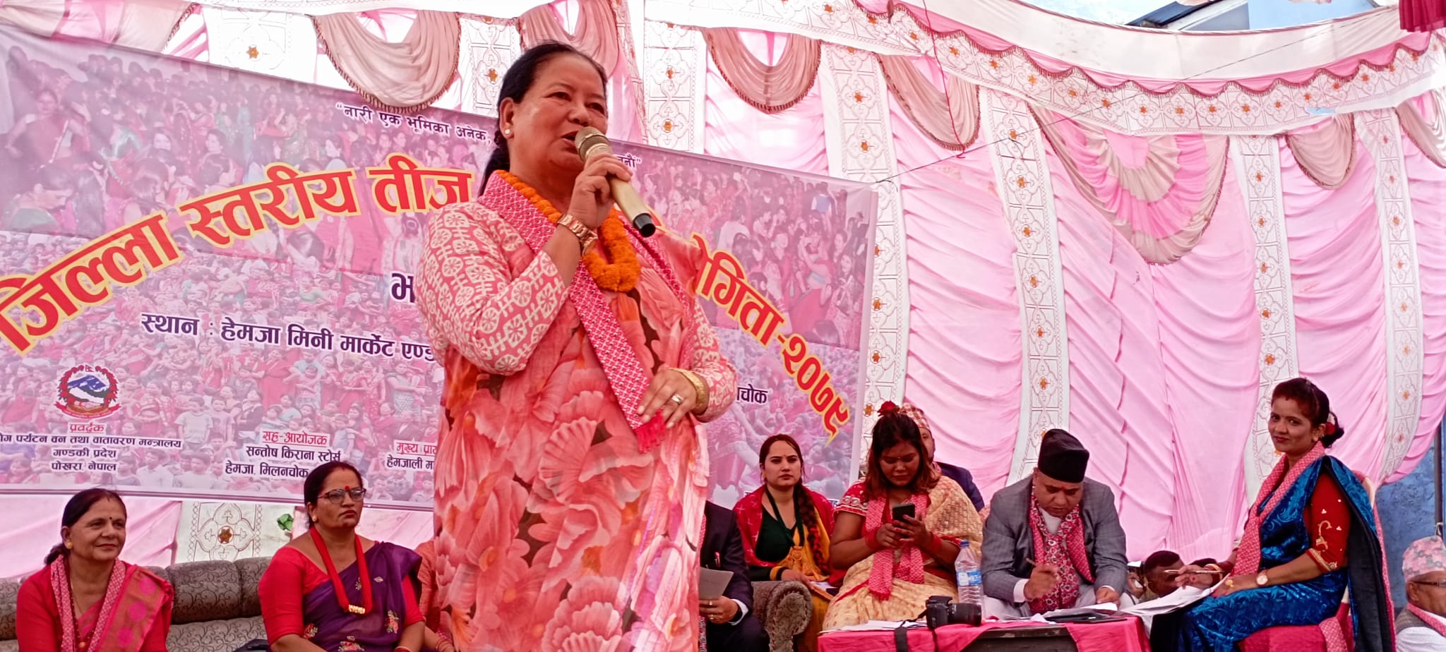 सफल उद्यमी महिला समुह पोखरा २५ हेमजाले मंगलबार आयोजना गरेको कास्की जिल्ला स्तरीय तीज गीत प्रतियोगिताको उद्घाटन गदै उहाँले विगतमा तीजमा सासु र आँशुका विषयमा जोडेर गीत गाँउदै आएको भएपनि पछिल्लो समय परिवर्तन हुदै आएको बताउनुभयो । महिलाले धेरै आन्दोलन र संघर्ष मात्र परिर्वतनको नेतृत्व गदै आएकाले अहिले धेरै अधिकार प्राप्त गरेकै कारण महिलाहरु देशको प्रमुख पदमा पुगेको बताउदै भन्नुभयो,‘महिलाहरुले आफनो अधिकारका बारेमा आवाज बुलन्द्ध गरेर आन्दोलन नगरेको भए अहिलेको अवस्था आउने थिएन् । त्यसैले अव रोयर बस्ने दिन गए ।’ उहाँले आर्थिक विकास र समृद्धिका गीत गाउनुपर्ने बताउनुभयो ।