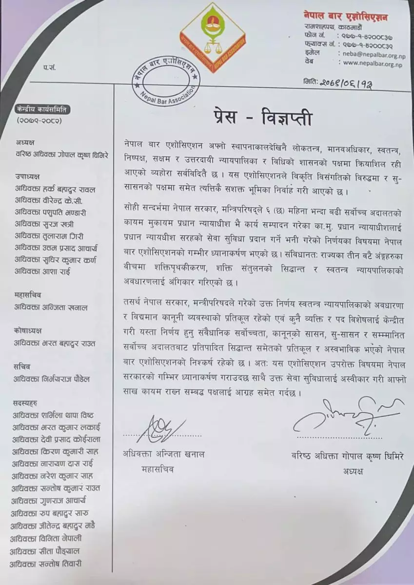 बारले विज्ञप्तिमा भनेको छ, ‘नेपाल सरकार मन्त्रिपरिषदले गरेको उक्त निर्णय स्वतन्त्र न्यायपालिकाको अवधारणा र विद्यमान कानुनी व्यवस्थाको प्रतिकूल रहेको एवं कुनै व्यक्ति र पद विशेषलाई कन्द्रित गरी यस्ता निर्णय हुनु संवैधानिक सर्वोच्चता, कानुनको शासन, सुशासन र सम्मानित सर्वोच्च अदालतबाट प्रतिपादित सिद्धान्त समेतको प्रतिूकल र अस्वाभाविक भएको नेपाल बार एशोसिएशनको निष्कर्ष छ।’
