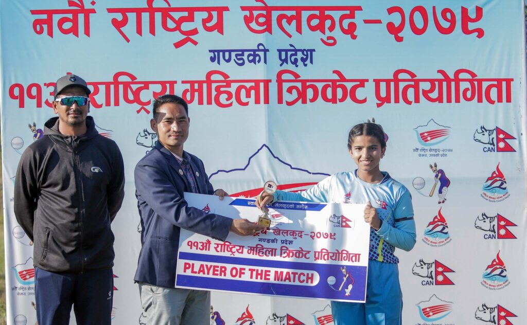 पोखरा रंगशालामा आईतबार भएको प्रतिस्पर्धामा बागमती प्रदेशले मधेश प्रदेशलाई ८ विकेटले पराजित गर्दै अन्तिम चारमा प्रवेश गरेको हो । ५४ रनको लक्ष्य पछ्याएको बागमतीले २ विकेटको क्षतिमा पुरा गर्यो । ४० बल बाँकी रहँदा बागमतीकी अनिषा माझकोटी र सुमन खतिवडाले अविजित १६ र १७ बनाएपछि सहज जित दर्ता गर्यो । अस्मिता खरेलले १३ रन बनाईन् ।