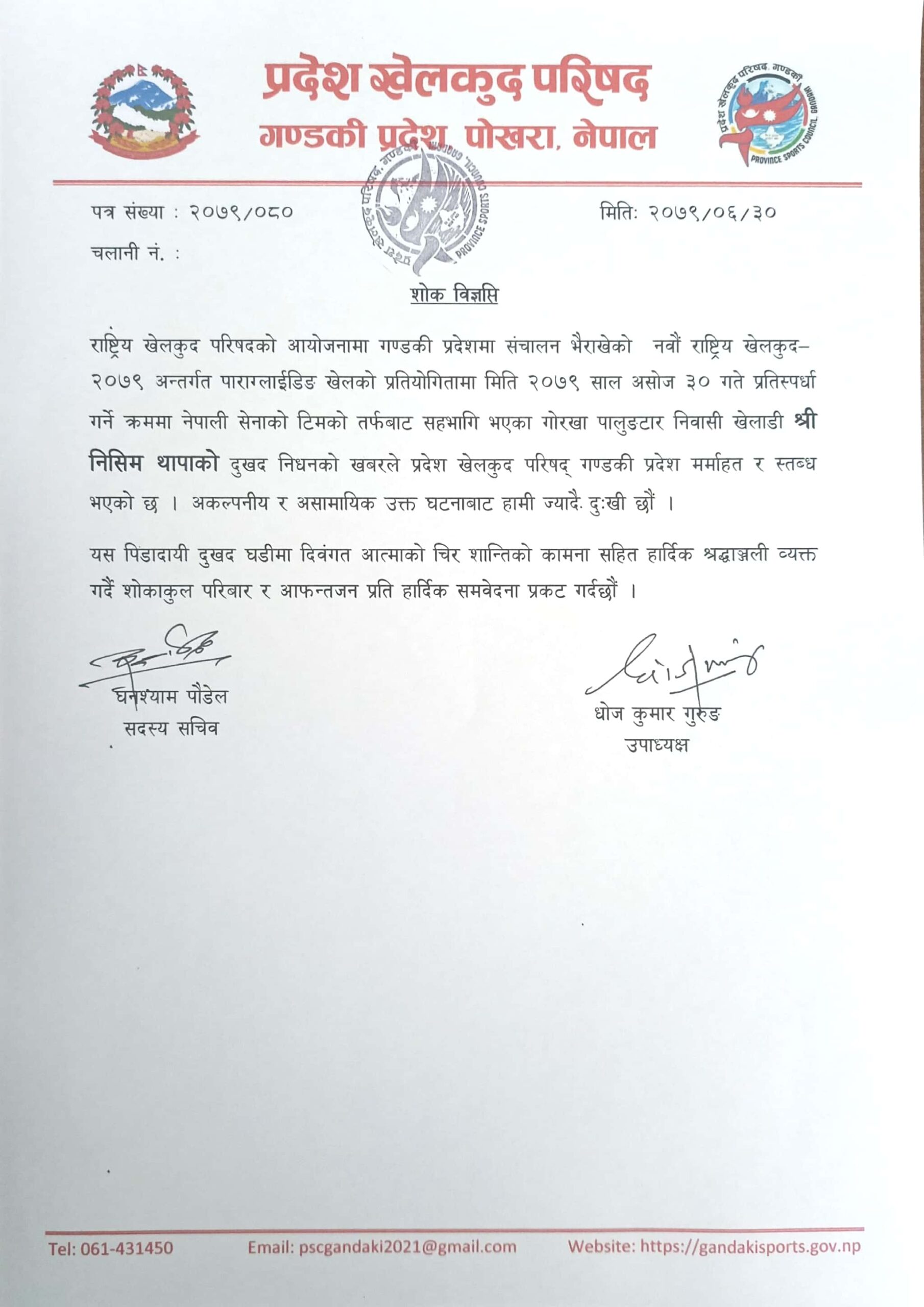 निसिमको निधनमा प्रदेश खेलकुद गण्डकीद्वारा दुःख व्यक्त