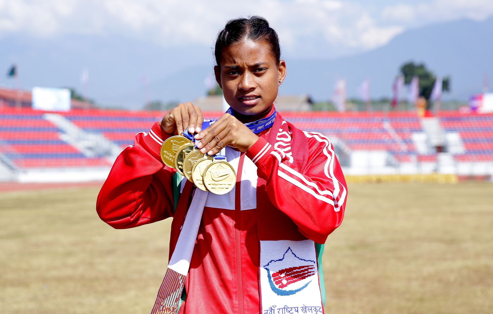नवौं राष्ट्रिय खेलकुद अन्तर्गत एथलेटिक्सका ५ इभेन्टमा त्रिभुवन आर्मीकी जयरानी थारुले ५ स्वर्ण पदक जितेकी छन् ।