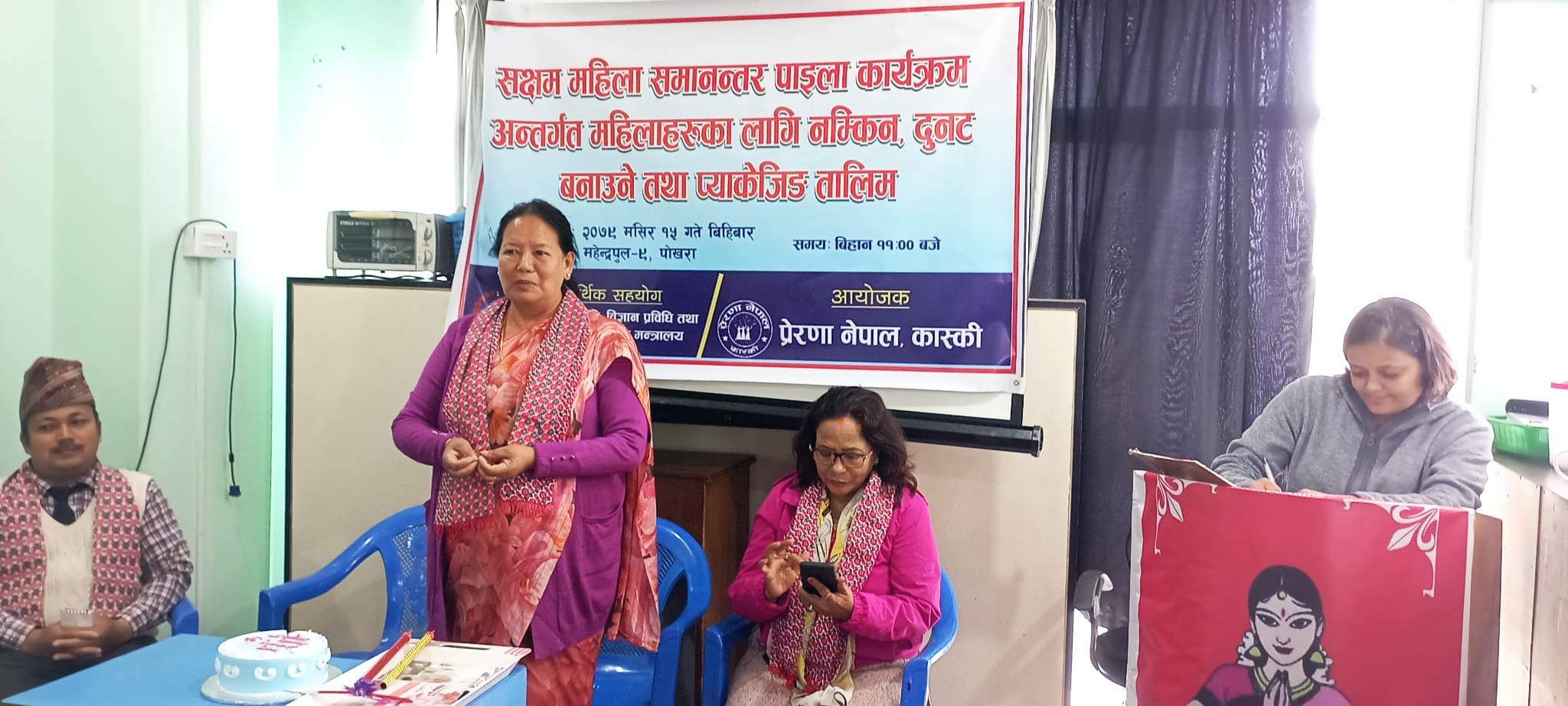 शिक्षा, संस्कृति, विज्ञान प्रविधि तथा सामाजिक विकास मन्त्रालयको आर्थिक सहयोगमा ‘सक्षम महिला, समानान्तर पाइला’ कार्यक्रम अन्तर्गत प्रेरणा नेपाल कास्कीले तालिम आयोजना गरेको हो । २० प्रशिक्षार्थी सहभागी तालिम पोखरा महानगरकी उपमेयर मञ्जुदेवी गुुरुङले सुरुआत गरिन् । आर्थिक रुपमा आत्मनिर्भर भए लैंगिक समानता, हिंसा न्यूनीकरणका लागि समेत सहयोग पुग्ने उनको भनाइ छ ।