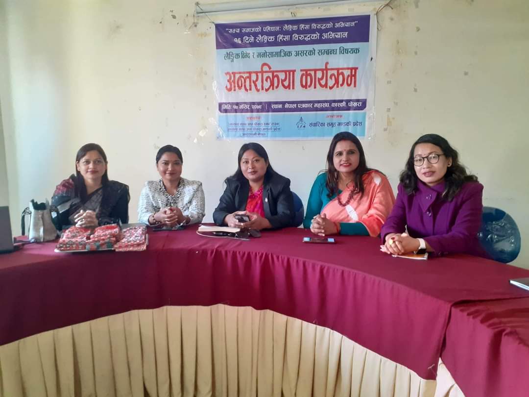 पोखरा, १७ मंसिर ।हिंसा सहेर बस्न नहुने, हिंसाको प्रतिकार गर्नुपर्ने शनिवार पोखरामा आयोजित एक कार्यक्रमका वक्ताहरुले जोड दिएका छन् । सञ्चारिका समूह गण्डकी प्रदेशको आयोजना तथा लायन्स क्लब अफ पोखरा स्मार्ट टाउन र लायन्स क्लब अफ पोखरा गण्डकी प्रदेश अन्तरध्वनी नेपालको सहकार्यमा “सभ्य समाजको पहिचान, लैङ्गिक हिंसा विरुद्धको अभियान” १६ दिने लैङ्गिक हिंसा विरुद्धको अभियान अन्तर्गत लैङ्गिक विभेद र मनोसामाजिक असरको सम्बन्ध विषयक अन्तरक्रिया कार्यक्रममा बोल्ने वक्ताहरुले कसैले हिंसा गरेमा नो र नाई भनेर प्रतिकार गर्नुपर्ने बताएका हुन् ।