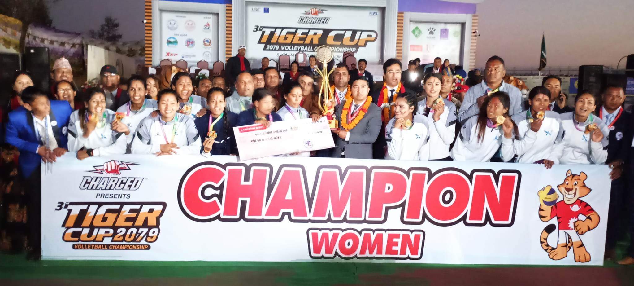 पाेखरा, माघ १४ गते ।पाेखरामा सम्पन्न तेस्रो टाईगर कप भलिबल प्रतियोगिता अन्तर्गत महिला तर्फकाे उपाधिमा सशस्त्र प्रहरी बलले आफनो नाम लेखाएको छ ।