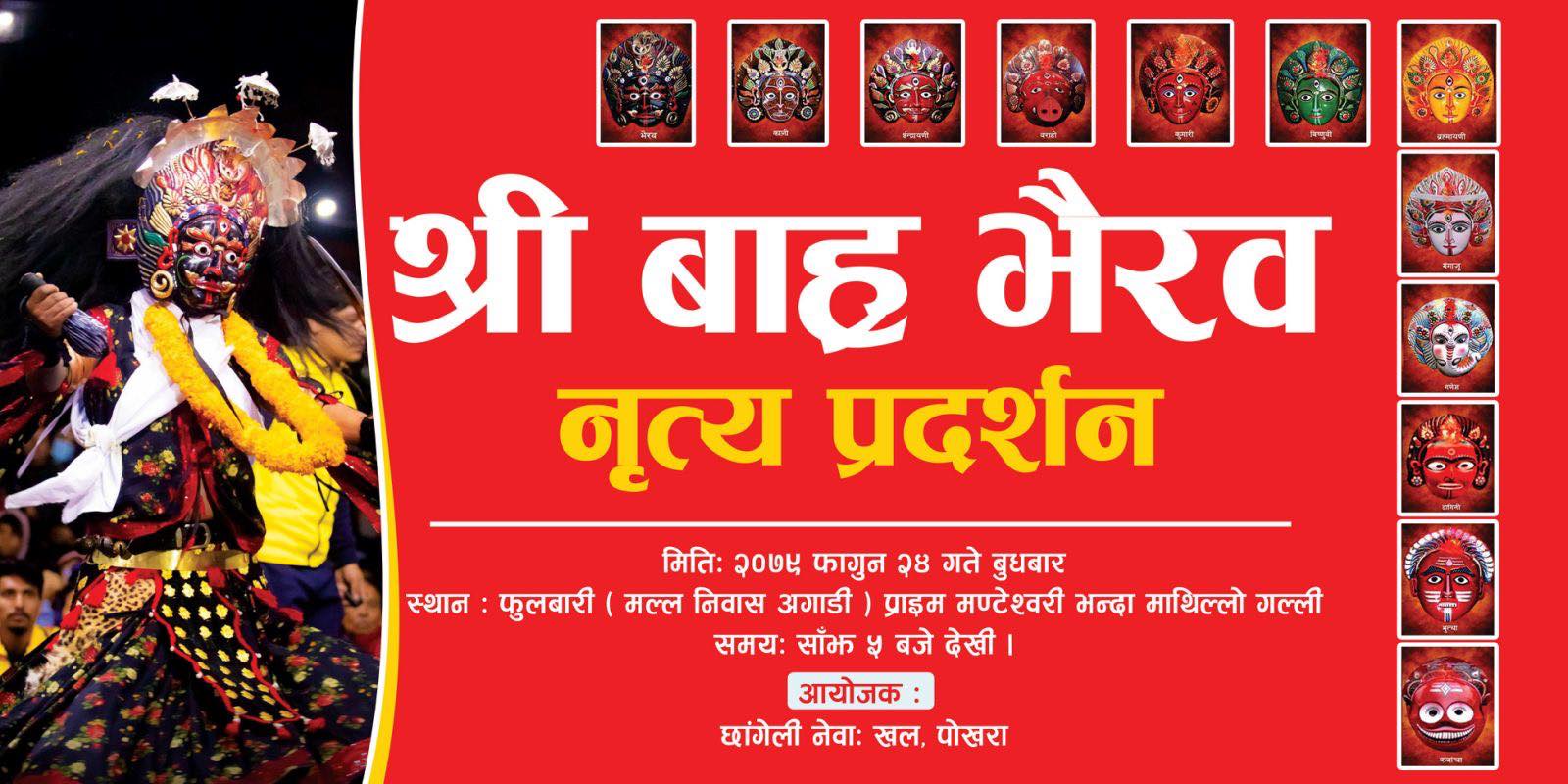 पोखरा, फागुन ११ गते । छँगेली नेवा खल, पोखराको आयोजनामा भैरव नाच कार्यक्रम हुने भएको छ । फागुन २४ गते पोखरा फुलबारीमा नाच आयोजना गर्न लागिएको छँगेली नेवा खल, पोखराका अध्यक्ष शिबलाल मल्लले जानकारी दिनुभयो ।