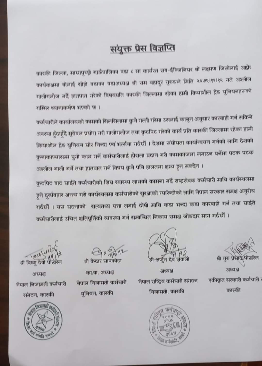 वडा नम्बर ८ अध्यक्ष रामबहादुर गुरुङले शुक्रबार आफ्नै कार्यकक्षमा गालीगलौज तथा कुटपिट गरेको भन्दै गुरुङलाई कारबाही गर्न मागसहित इन्जिनियर जिसीले जिल्ला प्रहरी कार्यालय कास्कीमा उजुरी दिएका हुन् ।वडाध्यक्ष गुरुङले इन्जिनियरसँग भनेको नमानेकाले भनाभन हुँदा धकेलाधकेलमात्र भएको प्रतिक्रिया दिए ।