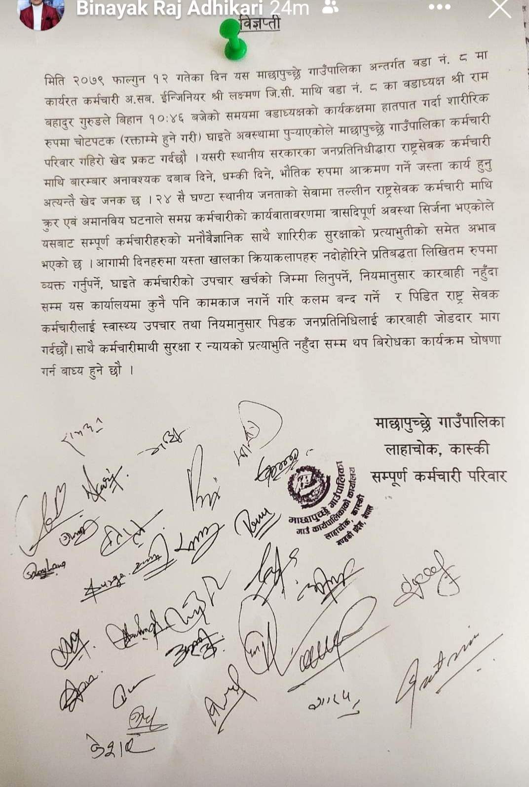 पोखरा, फागुन १२ गते। कास्कीको माछापुच्छ्रे गाउँपालिका कार्यरत असिस्टेन्ट सब इन्जिनियर लक्ष्मण जिसीले वडाध्यक्षले कुटपिट गरेको भन्दै प्रहरीमा उजुरी दिएका छन् ।
