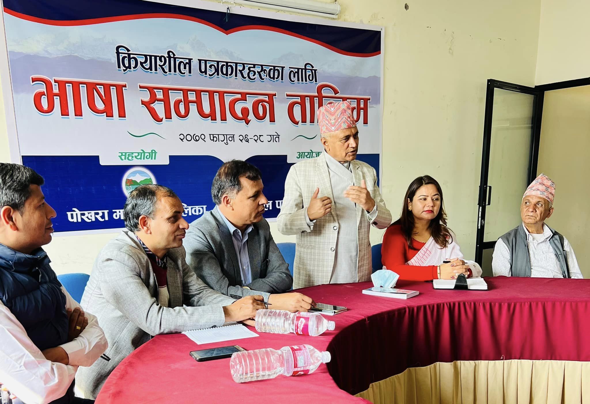 पोखरा, फागुन २६ गते । क्रियाशील पत्रकारहरुका लागि पोखरामा भाषा सम्पादन तालिम सुरु भएको छ । पोखरा महानगरपालिकाको सहयोगमा नेपाल पत्रकार महासंघ कास्कीको आयोजनामा शुक्रबार देखि आइतबार सम्म तालिम हुनेछ ।