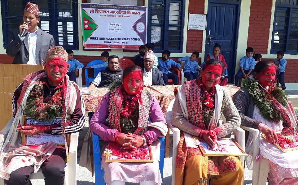 पोखरा, फागुन २६ गते । कास्कीको रूपा गाउँपालिका–२, थुम्कीस्थित शिवालय माध्यमिक विद्यालयमा निजी स्रोतमा कार्य गरेका एक शिक्षकलाई नगद रु. ४० हजार रुपैयाँसहित सम्मान गरी बिदाइ गरिएको छ ।शुक्रबार विद्यालयमा आयोजित शिक्षक बिदाइ तथा सम्मान कार्यक्रममा झण्डै १७ वर्षसम्म निजी स्रोतमा रही कार्य गरेका शिक्षक सुकबहादुर थापालाई विद्यालयले नगदसहित सम्मान गर्दै बिदाइ गरेका हो । २०६२ देखि विद्यालयमा कार्य गरेका उनले उमेर हदका कारण गत फागुन १ गतेदेखि स्वैच्छिक अवकाश लिएका थिए । उनले विद्यालयमा कार्यरत रहँदा गरेको योगदानको कदर गर्दै नगदसहित सम्मान गरिएको विद्यालय व्यवस्थापन समितिका अध्यक्ष धनपति ओझाले जानकारी दिए ।