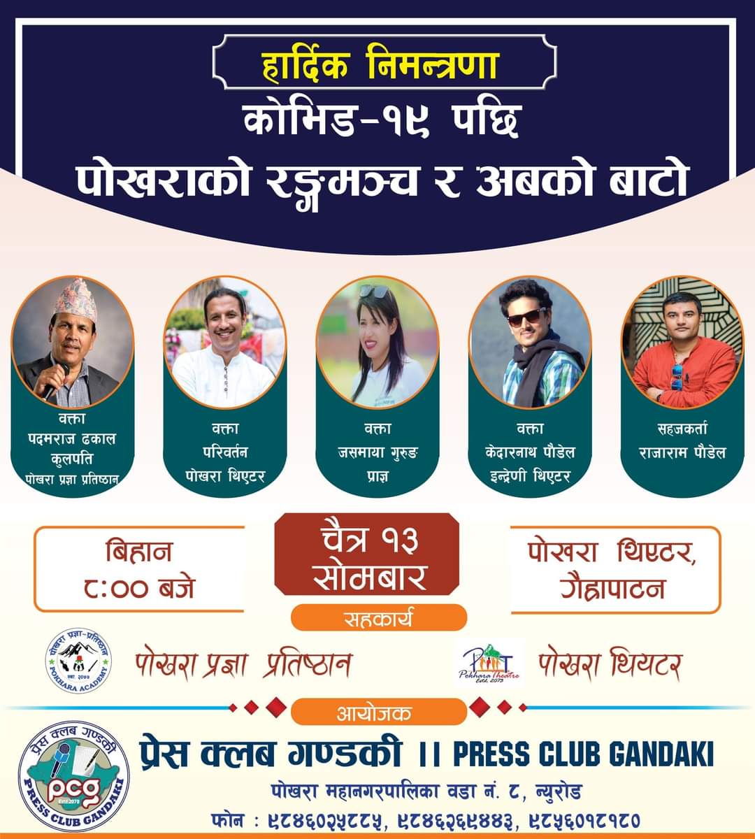 यसैगरी मञ्चले यहीं चैत्र १३ गते सोमबार ‘कोभिड–१९ पछिको पोखराको रंगमञ्च र अबको बाटो’ शिर्षकमा अन्तरक्रियात्मक छलफल कार्यक्रम गर्ने भएको छ ।
