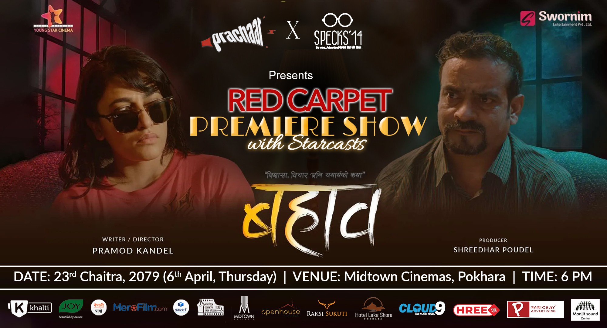 उनका अनुसार रेडकार्पेट शो मा राजनीतिज्ञ,कलाकार,पत्रकार,व्यवसायीहरु, प्रहरी र पोखराका विभिन्न संघसंस्थाको सहभागिता रहनेछ ।काठमाडौंको प्रिमियर शो पछि पोखरामा बहावको पहिलो पटक रेडकार्पेट शो गर्न लागिएको स्पेक्स फोर्टीनका संचालक महेश्वर सिङ भण्डारीले बताए । रेडकार्पेट शोलाई सफल पार्न सबैको सहयोग मिल्नेमा उनी आशावादी छन् ।