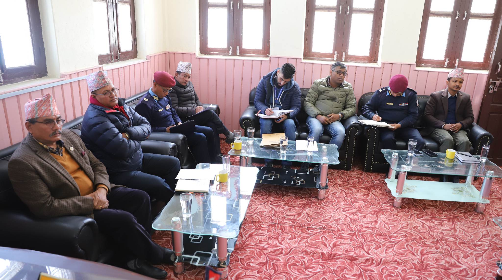 उक्त बैठकमा आन्तरिक मामिला तथा कानून मन्त्री रोशन बहादुर गाहा थापा, मन्त्रालयका सचिव बद्रीनाथ अधिकारी, नेपाल प्रहरीका गण्डकी प्रदेश प्रहरी प्रमुख प्रहरी नायब महानिरीक्षक बुद्धिराज गुरुङ, नेपाली सेनाका प्रमुख सेनानी इन्द्रराज गुरुङ, सशत्र प्रहरी बल नेपाल नम्बर ३३ गुल्म मुस्ताङका सशत्र प्रहरी नायब उपरीक्षक यज्ञमान साउद, जिल्ला प्रहरी कार्यालय मुस्ताङका प्रमुख प्रहरी नायब उपरीक्षक रविन्द्रनाथ पौडेल र राष्ट्रिय अनुसन्धान व्यूरोका मुस्ताङ प्रमुख मदन पौडेल, आन्तरिक मामिला तथा कानून मन्त्रालयका उपसचिव सुरण शर्मा पौडेल र चण्डिका पौडेल, सहायक प्रमुख जिल्ला अधिकारी चन्द्रकान्त बस्नेत तथा सुचना अधिकारी शिव लम्सालको सहभागिता रहेको थियो ।