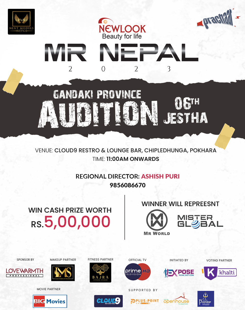 पोखरा/ मिस्टर नेपालको गण्डकी प्रदेश अडिसन जेठ ६ गते हुने भएको छ । १५ औं संस्करणको मिस्टर नेपालका लागि यसपटक क्षेत्रीय अडिसन गर्न लागिएको हो।