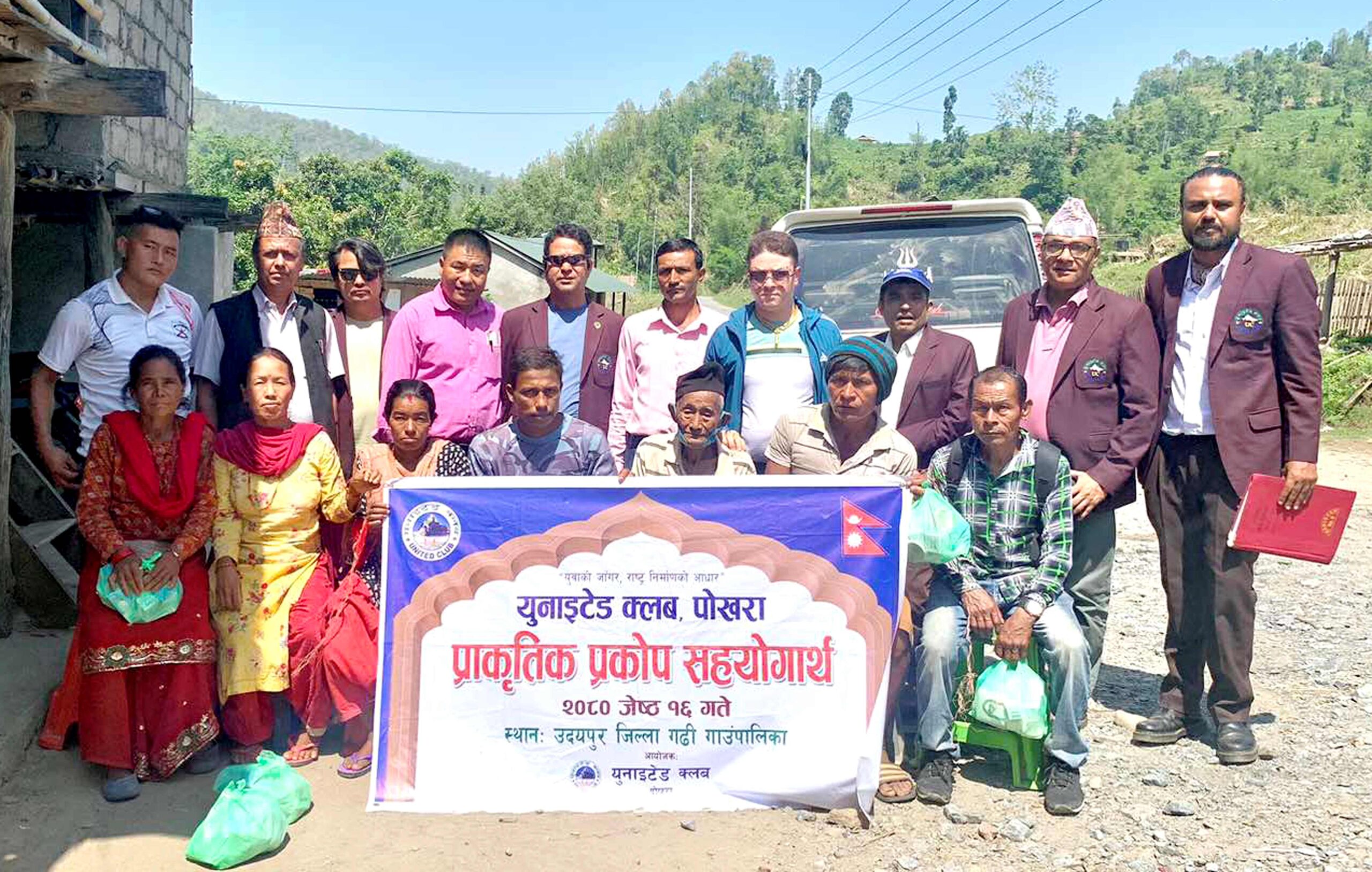 पोखरा ।उदयपुरको गढी गाँउपालिकाका हावाहुरी प्रभावितहरुलाई युनाइटेड क्लबले राहत प्रदान गरेको छ । युनाइटेड क्लब पोखराले विपद ब्यवस्थापन सहयोगार्थ कोष अन्तर्गत उदयपुर जिल्लाको गढी गाँउपालिका वडा नम्बर १, २ र ५ मा हावाहुरीका कारण पूर्ण रुपमा घर क्षती भएका २५ परिवारलाई राहत वितरण गरेकोे हो । नेपालीहरुको महान पर्व दिपावलीको अवसरमा देउसीभैलो कार्यक्रमको आयोजना गरी स्थापना गरिएको विपद ब्यवस्थापन कोष अन्तर्गत युनाइटेड क्लब पोखराले उक्त क्षेत्रमा राहत वितरण गरेको हो ।