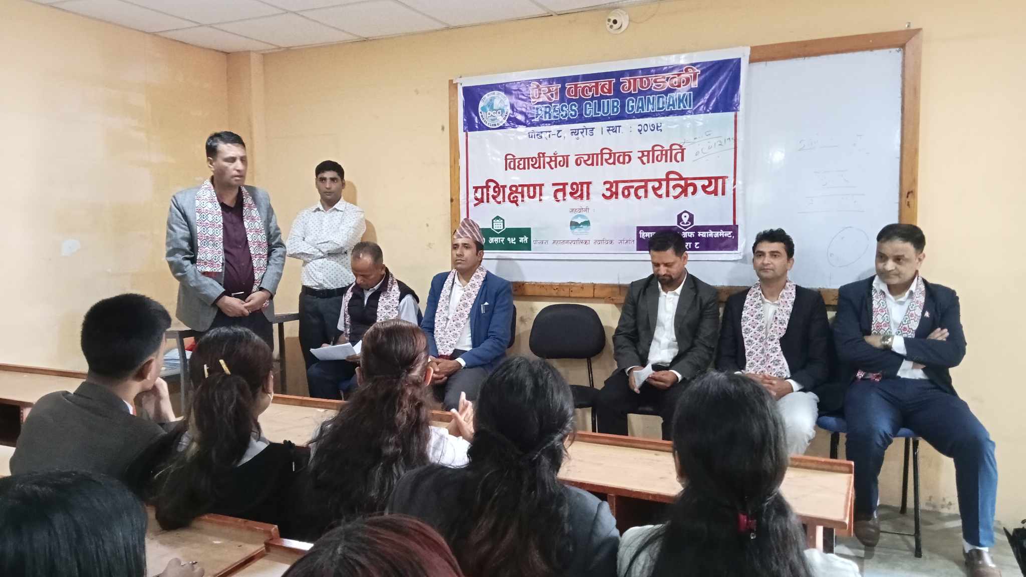 प्रेेस क्लब गण्डकीका अध्यक्ष एकराज गिरीककाे अध्यक्ष तामा भएकाे कार्यक्रममा क्याम्पसका क्याम्पस प्रमुख जनकराज पाैडेल  र प्रेस क्लब गण्डकीका काेषाध्यक्ष राजु गिरी लगायचले बाेलेका ।कार्यक्रममा पाेखरा महानगर न्याायिक समिति सदस्य कालिदास पाेखरेल  कानुन अधिकृत राममणी अधिकारे गठन प्रकृया बारे प्रशिक्षण दिए ।
