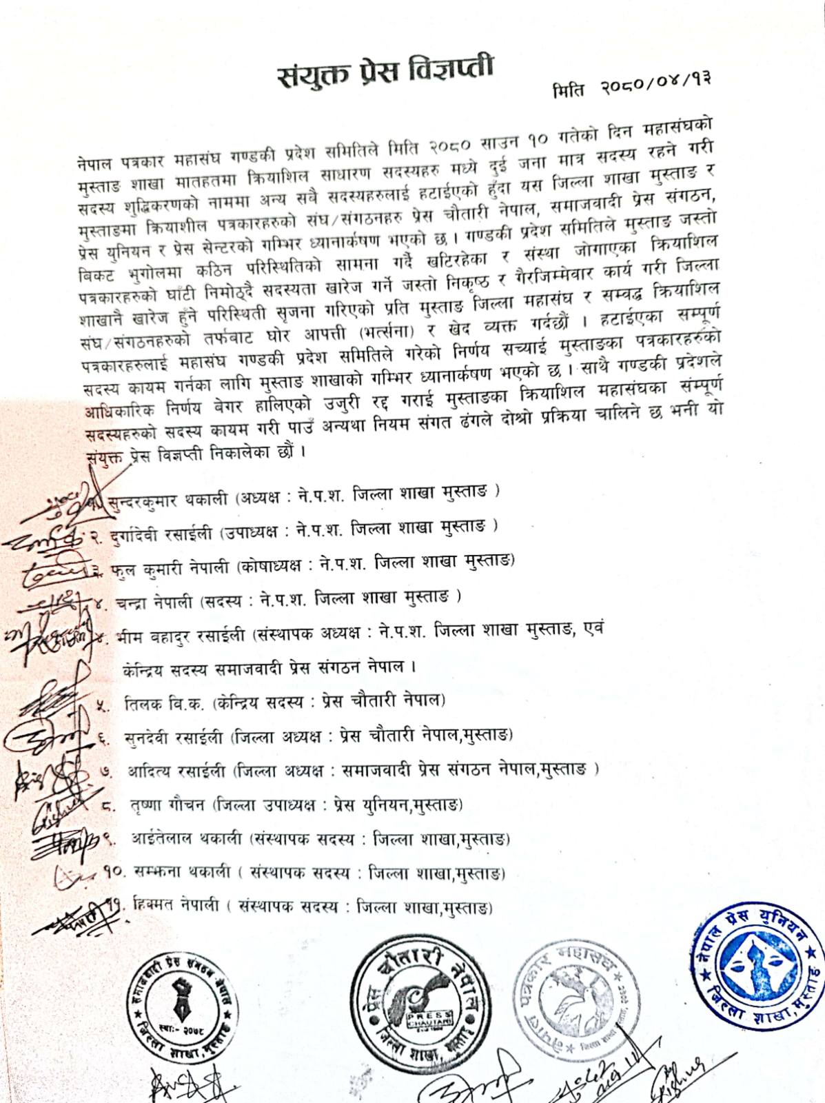मुस्ताङ शाखा सदस्य कायम गर्न दवाब सृजना गर्दै शाखाका अध्यक्ष सुन्दरकुमार थकालीसहित प्रेस चौचारी नेपालका जिल्ला अध्यक्ष सुनदेवी रसाईली, समाजवादी प्रेस संगठन नेपालका जिल्ला अध्यक्ष आदित्य रसाईली र प्रेस युनियन जिल्ला शाखा मुस्ताङका उपाध्यक्ष तृष्णा गौचनले संयुक्त प्रेस विज्ञप्तीमा हस्ताक्षर गरेका छन् ।