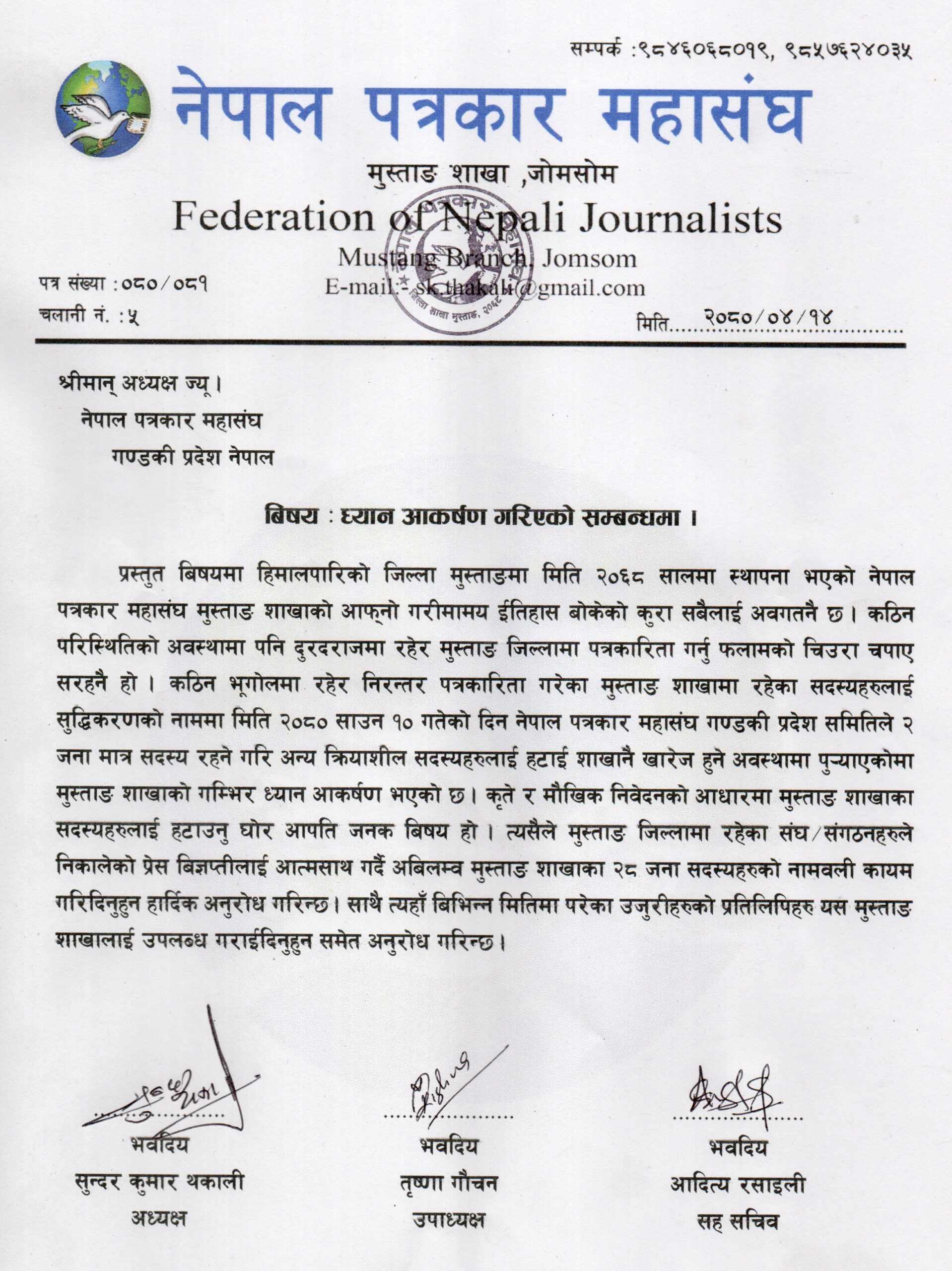 नेपाल पत्रकार महासंघ गण्डकी प्रदेश समितिले मिति २०८० साउन १० गतेको दिन महासंघको मुस्ताङ शाखा मातहतमा क्रियाशिल साधारण सदस्यहरु मध्ये २ जनाको मात्र सदस्य रहने गरी सदस्य सुद्धिकरणको नाममा अन्य सबै सदस्यहरुलाई हटाईएको प्रति खेद व्यक्त गरेका हुन् ।