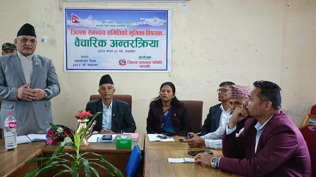 गण्डकी प्रदेश सभा सदस्य तथा निबर्तमान मुख्य मन्त्री खगराज अधिकारीले जिल्लाको आधारभुत इकाइको रूपमा जिल्ला समन्वय समितिको बारेमा संविधानले ब्याख्या गरेका ब्यबस्था खुल्ला दिलले कार्यान्वयन गर्नुको बिकल्प नभएको बताउनुभयो।