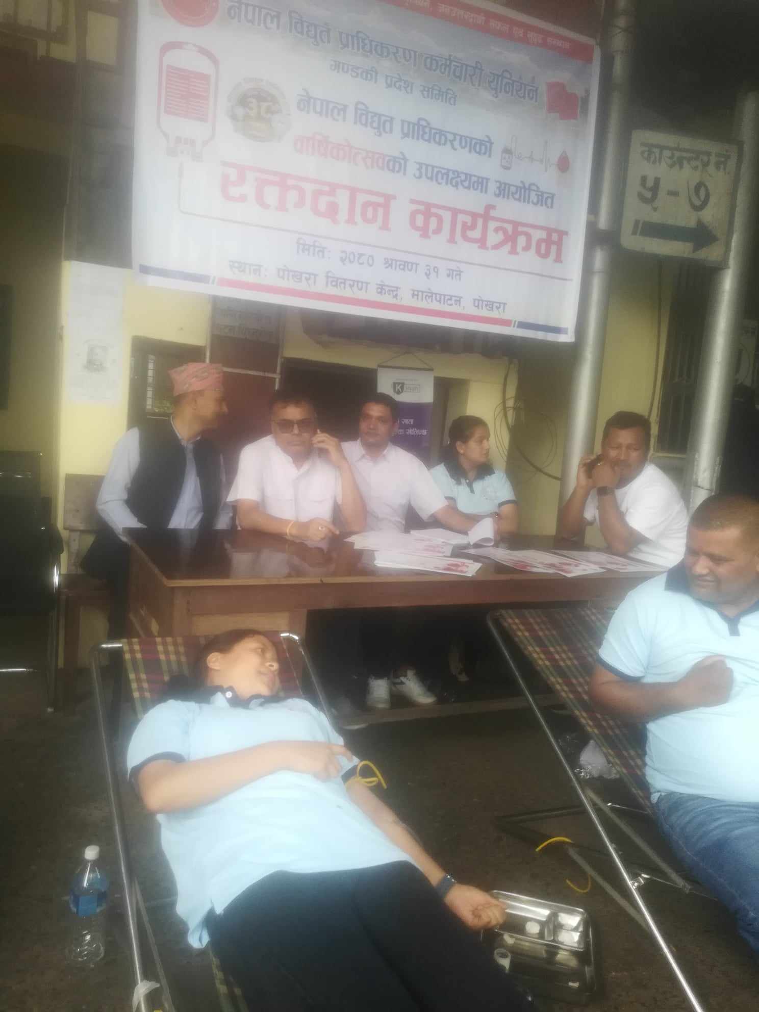 पोखरा, ३१ साउन ।नेपाल विद्युत प्राधिकरणको वार्षिकोत्सवको अवसर पारेर रक्तदान कार्यक्रम सम्पन्न भएको छ । प्राधिकरणले वृहत रक्तदान गर्दै मानव जीवनमा रगतको अभाव नहोस् भन्ने उद्देश्य राखेको जनाएको छ ।