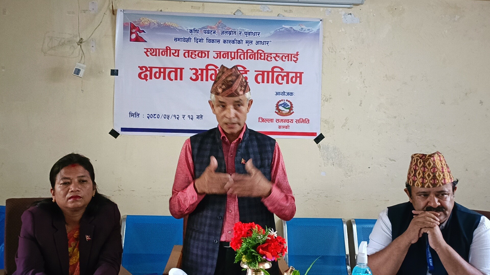 पाेखरा, भदौ १२ गते ।जिल्ला समन्वय समिति कास्कीको आयोजनामा कास्कीका स्थानीय तहका जनप्रतिनिधि वडा सदस्यहरूको लागि क्षमता अभिबृद्धी तालिम सोमबार शुरु भएको छ।तालिमको जिल्ला समन्वय समिति कास्कीका प्रमुख लिलाधर पौडेलले उद्घाटन गर्नुभएको थियो।