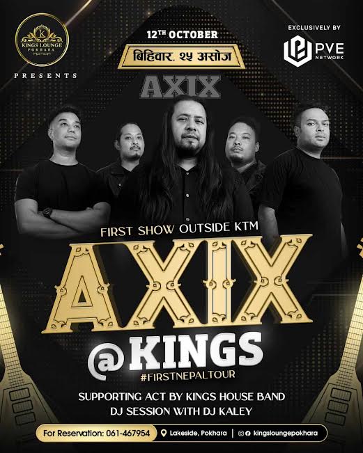 किङसमा एक्सिस व्याण्डको प्रस्तुतीः सहित किङस हाउस व्याण्ड र डि.जे. गरी तीन चरणको कार्यक्रम हुने भएको किङसका लाउन्ज पोखराका संचालक धु्रर्व केसीले बताउनु भयो ।