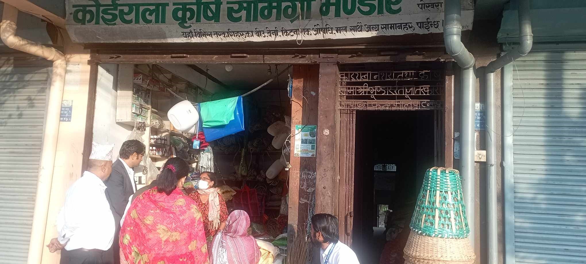 यता पोखरा ५ मा रहेको सुरक्षा कृषि सामाग्री भण्डाले मल विक्री गरेको तर बिल बिजक जारी नगरेको र विउविजन, विषादी बिक्रीका लागि अनुमति पत्र देखाउन नसकेका कारण सम्पूर्ण कागजपत्र लिएर बिहिबार जिल्ला कार्यालय आउन निर्देशन दिइएको छ भने पोखरा ७ मा सञ्चालनमा रहेको शोभा ट्रेड्र्स कृषि औजार भण्डारले अनुमति विना विउविजन विक्री वितरण गरेको फेला गरेको र अनुमति लिएर मात्रै बिक्री गर्न अनुरोध गरिएको महानगर कृषि महाशाखा प्रमुुख मनहर कडरियाले जानकारी दिए । विना अनुमति अनुदानको मल बढि मुल्यमा बिक्री गर्नेहरुलाई जिल्ला प्र्रशासन कार्यालयमा उपस्थित हुन निर्देशन दिइएको र कारबाही त्यहीबाट हुने प्रमुख कडरियाले बताए ।