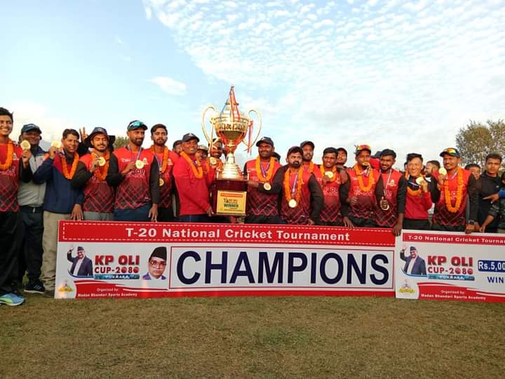 पोखरा । केपी ओली कप टी–२० राष्ट्रिय क्रिकेट प्रतियोगिताको उपाधि मधेश प्रदेशले जितेको छ । फाइनलमा त्रिभुवन आर्मी क्लबलाई ११ रनले पराजित गर्दै केपी ओली कप टी–२० राष्ट्रिय क्रिकेट प्रतियोगिताको उपाधि जितेको हो ।