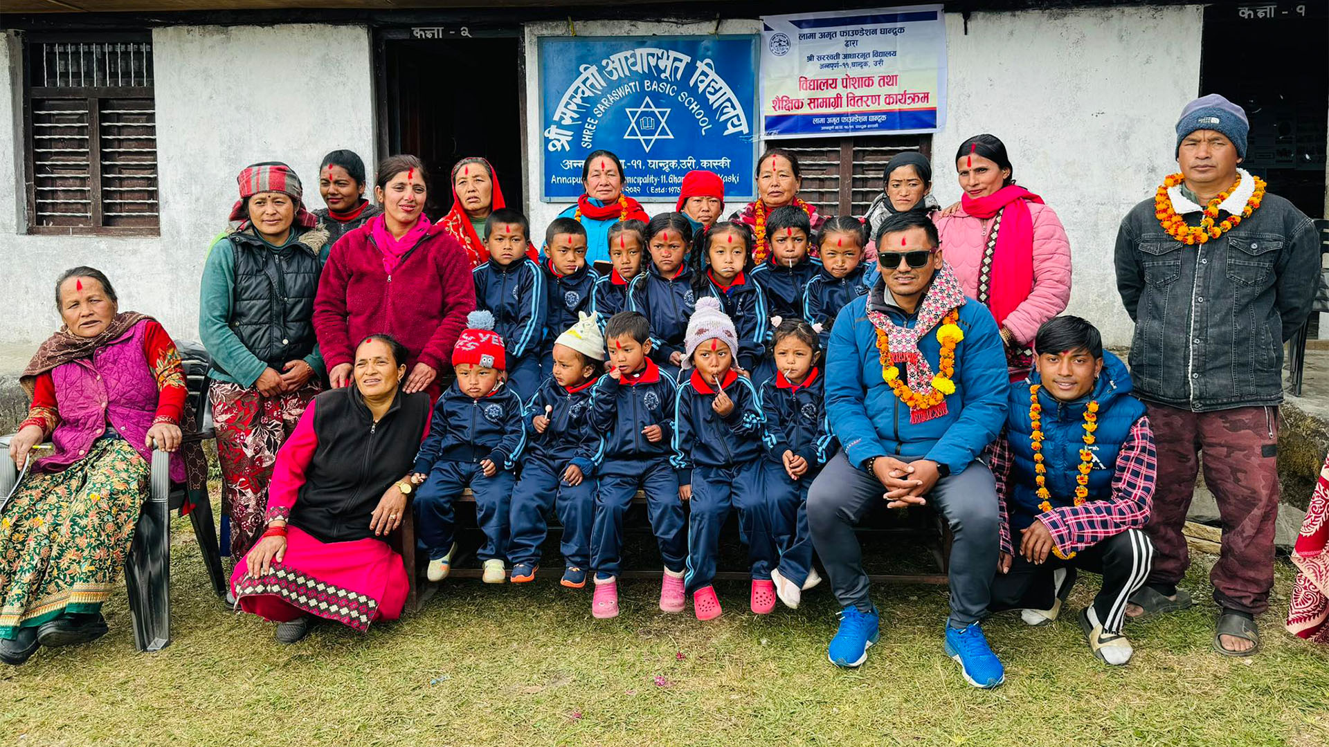 पोखराः लामा अमृत फाउण्डेशन घान्द्रुकका संस्थापक अमृत गुुरुङले घान्द्रुकका तीन विद्यालयमा शैक्षिक सामग्री र पोशाक वितरण गरेका छन् ।