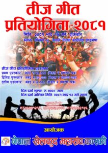 तीज गीत प्रतियोगितामा प्रथमले १५ हजार, द्धितियले १० हजार, तृतीयले ७ हजार, मेडल र प्रमाणपत्र प्राप्त गर्ने छन् ।प्रतियोगितामा सहभागीताका लागि भदौ १३ गतेसम्म टिम दर्ता गर्नुपर्ने र दर्ता वापत ५ सय रुपैयाँ शुल्क लाग्ने महासंघले जनाएको छ ।