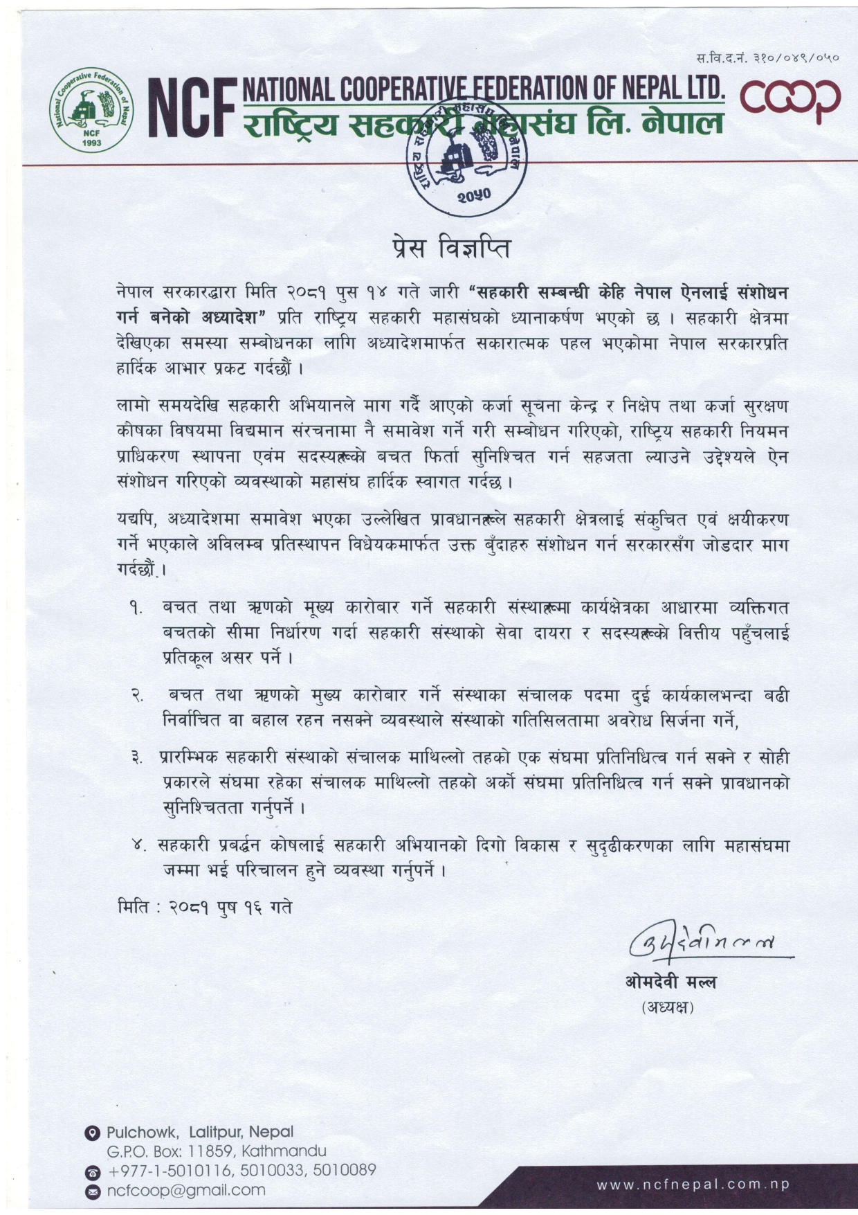 यद्यपि, अध्यादेशमा समावेश भएका उल्लेखित प्रावधानहरुले सहकारी क्षेत्रलाई संकुचित एवं क्षयीकरण गर्ने भएकाले अविलम्ब प्रतिस्थापन विधेयकमार्फत उक्त बुँदाहरु संशोधन गर्न सरकारसँग् जोडदार माग गर्दछौं ।बचत तथा ऋणको मुख्य कारोबार गर्ने संस्थाहरूमा कार्यक्षेत्रका आधारमा व्यक्तिगत बचतको सिमा निर्धारण गर्दा सहकारी संस्थाको सेवा दायरा र सदस्यहरूको वित्तीय पहुँचलाई प्रतिकुल असर पर्र्ने, बचत तथा ऋणको मुख्य कारोबार गर्ने संस्थाका संचालक पदमा दुई कार्यकालभन्दा बढी निर्वाचित वा बहाल रहन नसक्ने व्यवस्थाले संस्थाको गतिसिलमा अवरोध सिर्जना गर्ने,. प्रारम्भिक सहकारी संस्थाको संचालक माथिल्लो तहको एक संघमा प्रतिनिधित्व गर्न सक्ने र सोही प्रकारले संघमा रहेका संचालक माथिल्लो तहको अर्को संघमा प्रतिनिधित्व गर्न सक्ने प्रावधानको सुनिश्चितता गर्नुपर्ने माग गरिएको गरेको छ । सहकारी प्रबद्र्धन कोषलाई सहकारी अभियानको दिगो विकास र सुदृढीकरणका लागि महासंघमा जम्मा गरि परिचालन गर्ने व्यवस्था गर्नुपर्ने राष्ट्रिय सहकारी महासंघले गरेको छ ।