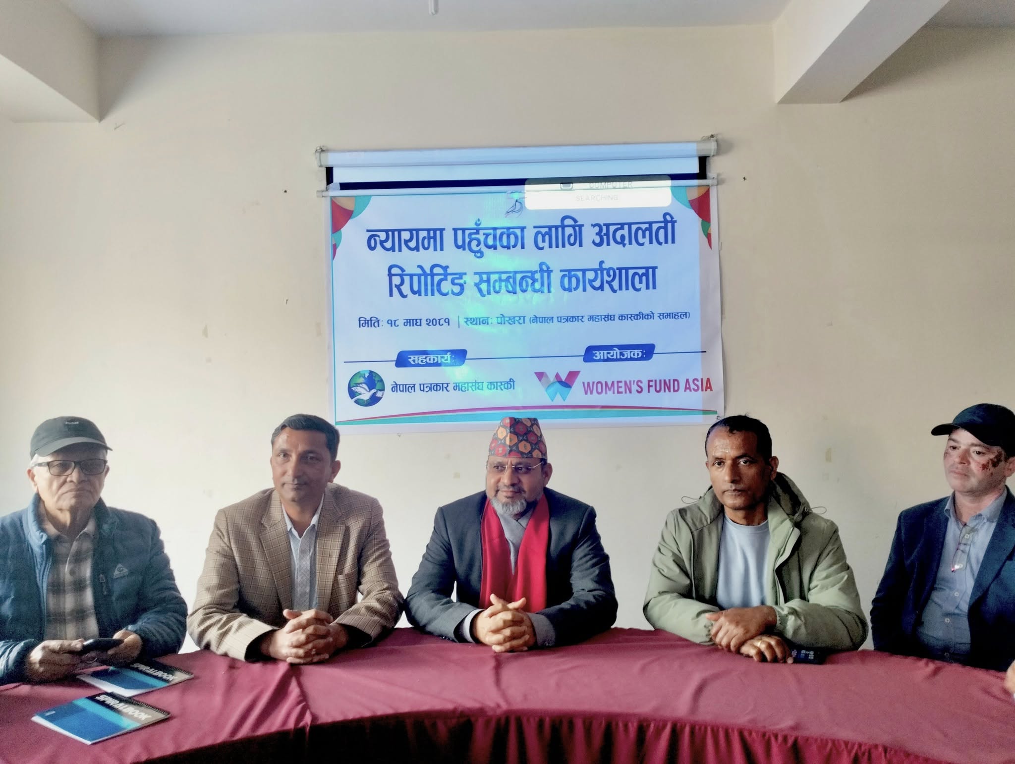 पोखरा । पत्रकार महिलाको क्षमता अभिवृद्धिमा सहयोग र न्यायमा पहुँच वृद्धिका लागि ‘अदालती रिपोर्टिङसम्बन्धी’ एक दिने कार्यशाला पोखरामा भएको छ । एसियाली महिला कोषको आर्थिक सहयोग, अधिवक्ता विनीता नेपालीको संयोजकत्व र नेपाल पत्रकार महासंघ कास्कीको समन्वयमा उक्र कार्यक्रम भएको हो ।