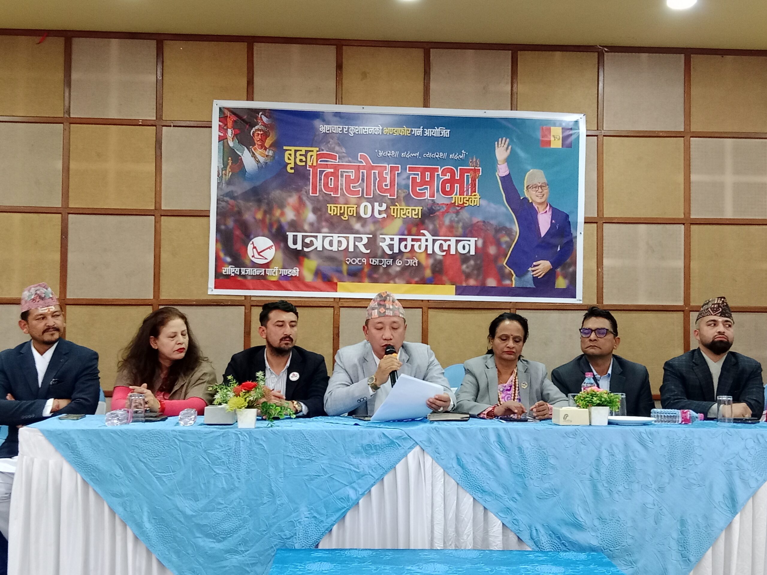 पोखरा, फागुन ७ गते । राष्ट्रिय प्रजातन्त्र पार्टी (राप्रपा) ले पोखरामा बृहत विरोध सभा आयोजना गर्ने भएको छ । भ्रष्टाचार र कुशासनको भण्डाफोर गर्ने उद्देश्यले फागुन ९ गते पोखरामा बृहत विरोध सभा गर्न लागेको आज पोखरामा पत्रकार सम्मेलनको आयोजना गरि जानकारी दिएको हो । ‘नवीन समझदारी’ मार्फत मुलुकलाई निकास दिने उद्देश्यसहित, ‘अवस्था बदल्न, व्यवस्था बदलौं’ भन्ने मूल नाराका साथ राप्रपा गण्डकीले पोखरामा भ्रष्टाचार र कुशासनको भण्डाफोर गर्न ‘बृहत विरोध सभा’आयोजना गर्ने तयारी गरेको राप्रपा गण्डकी प्रदेश अध्यक्ष पञ्चराम गुरुङले दिनुभयो ।