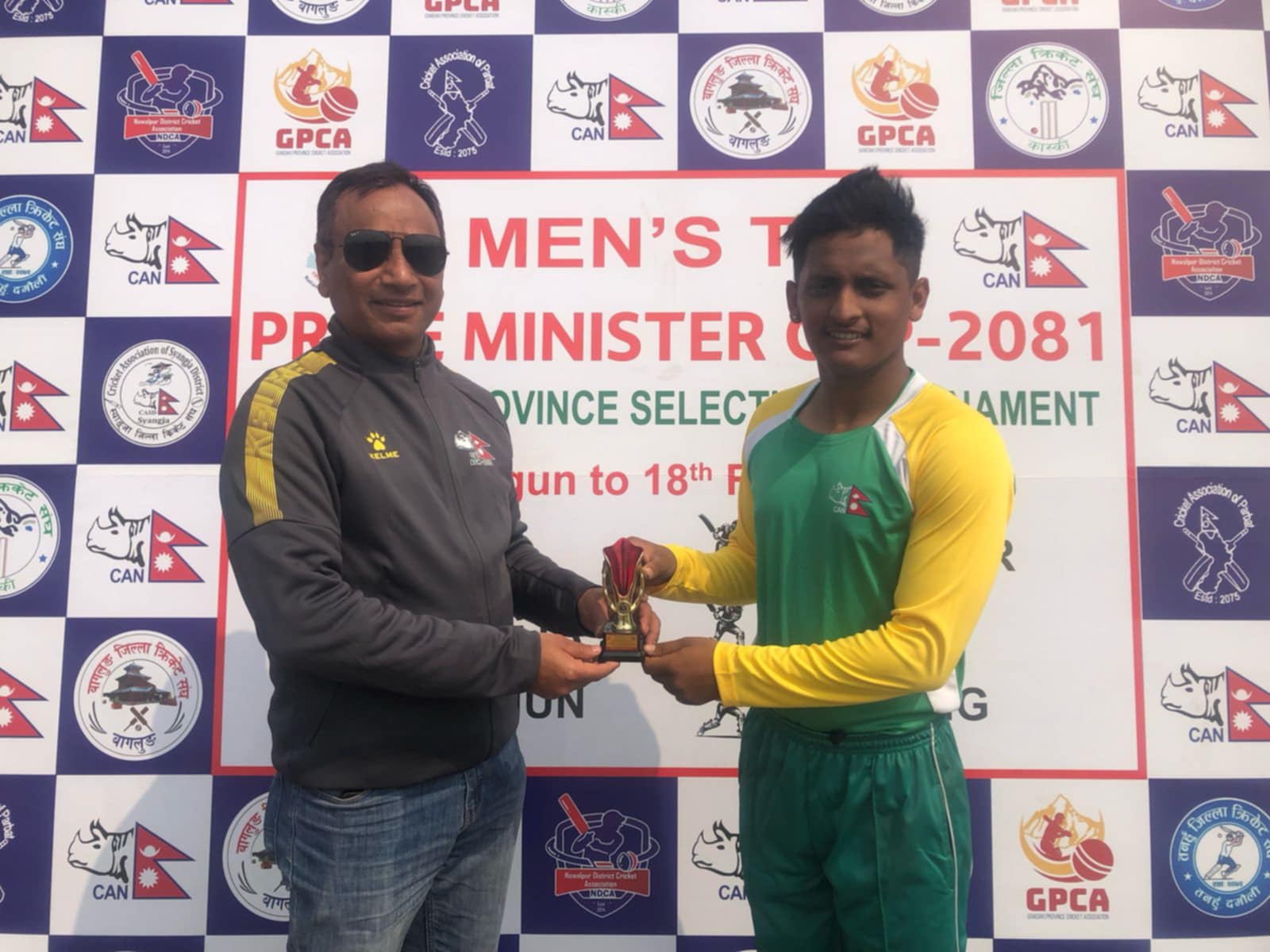 प्रधानमन्त्री कप एकदिवसीय क्रिकेट प्रतियोगिता अन्तर्गत गण्डकी प्रदेशस्रतीय प्रतिस्पर्धामा पर्वत पुरा ओभर टिक्न सकेन् । ओपनर सन्देश खड्का र सुशान चापागाँईले शुरुवात राम्रो गर्न सकेनन् । खड्का केवल ९ रनमा आउट भए । उनी विपिन खत्रीको बलमा अभिषेक थापाबाट क्याच भए ।