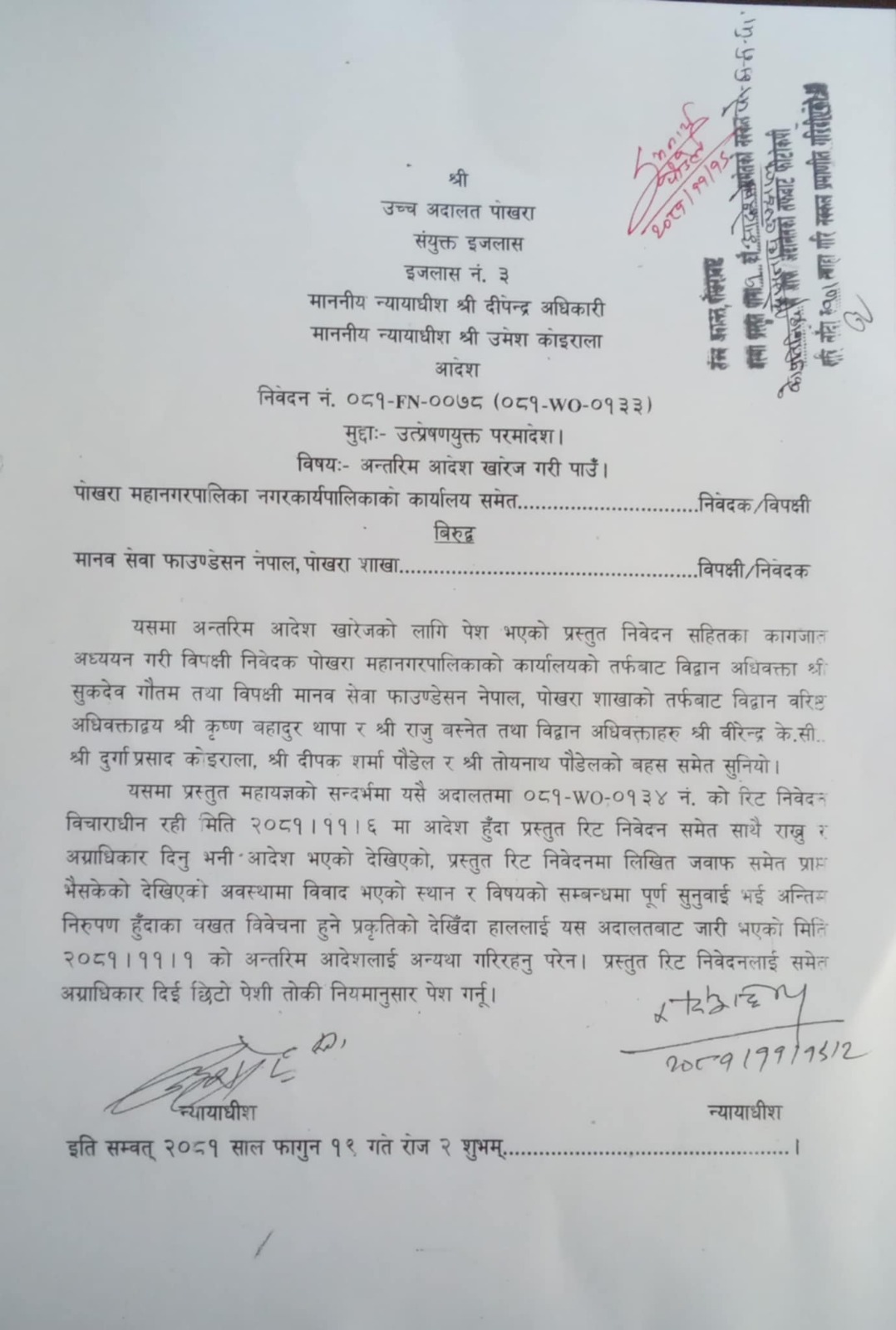 पोखरा महानगरपालिकाले कोटिहोम महायज्ञ रोक्न भन्दै विभिन्न स्थानमा परिपत्र गरेपश्चात श्री मानव सेवा फाउण्डेसन, नेपालले उच्च अदालतमा अन्तरिम आदेशको माग गरी रिट निवेदन दिएको थियाे ।