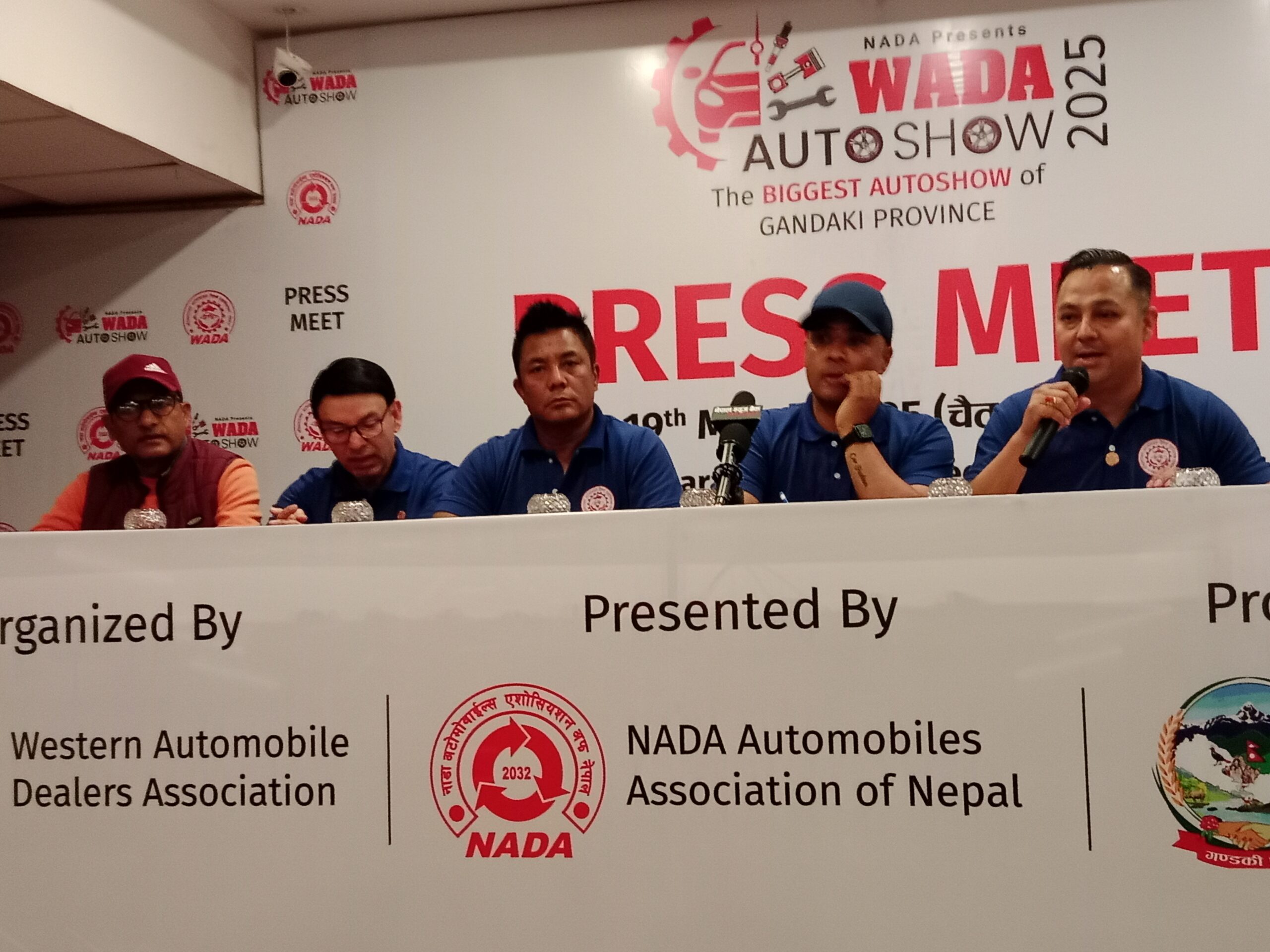 नाडा अटोमोबाइल्स एशोसिएशन अफ नेपालको सहयोगमा पश्चिमाञ्चल अटोमोबाइल्स डिलर्स एशोशिएसनद्वारा चैत्र १४ गतेदेखि १७ गतेसम्म पोखरा–१२ स्थित अमरसिंह खेलकुद मैदानमा ‘प्रथम नाडा प्रेजेन्ट्स् वाडा अटो शो २०२५’ को आयोजना गरिने आज पाेखरामा पत्रकार सम्मेलनकाे आयाेजना गरि जानकारी दिइएको हाे ।