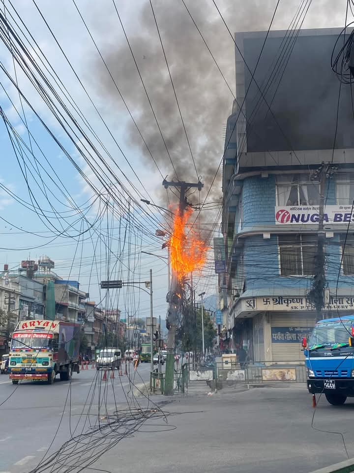 पाेखराकाे सभागृहचाेकमा बिजुलीको पाेलमा आगलागी