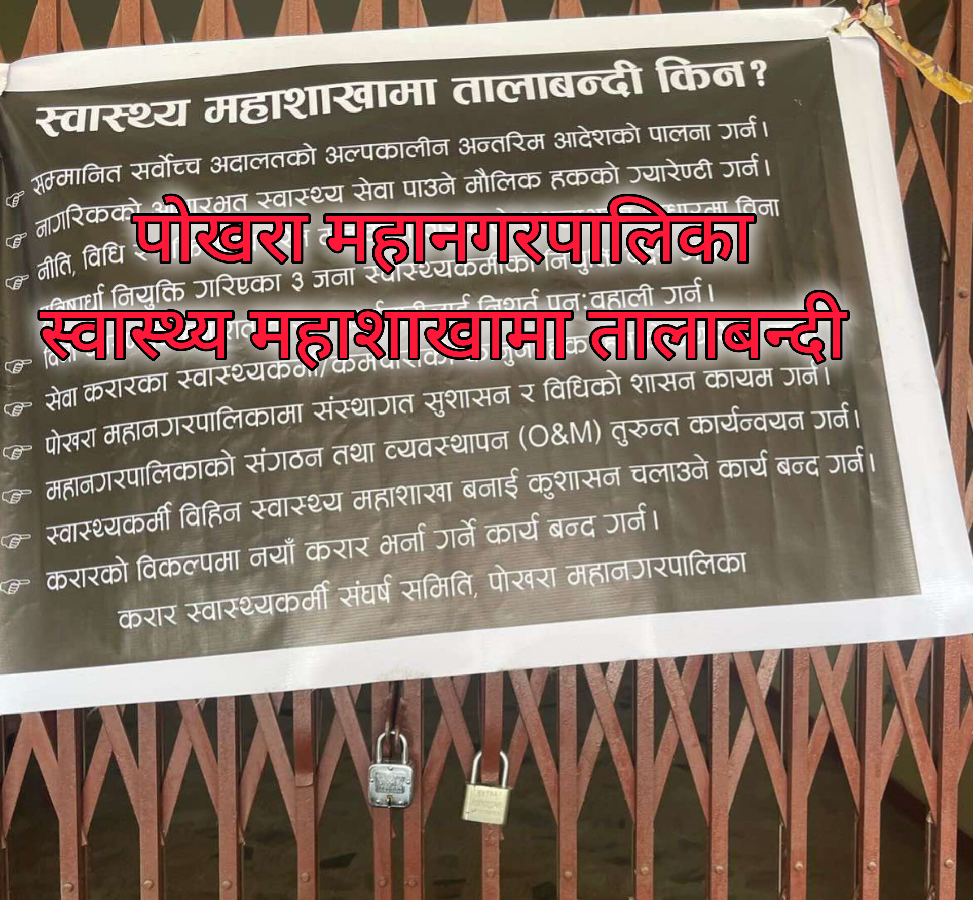 पाेखरा, बैशाख २ गते ।पोखरा महानगरपालिकाको स्वास्थ्य महाशाखामा तालाबन्दी गरिएको छ । करार सेवाबाट निष्कासन गरिएका स्वास्थ्यतर्फका ५८ जना कर्मचारीले मंगलबार महाशाखा प्रवेश गर्ने च्यानल गेटमा तालाबन्दी गरेका हुन् । महानगरले करारबाट निकाल्ने घोषणा गरेपछि स्वास्थ्यतर्फका कर्मचारी माघ २६ गतेदेखि आन्दोलित छन् ।