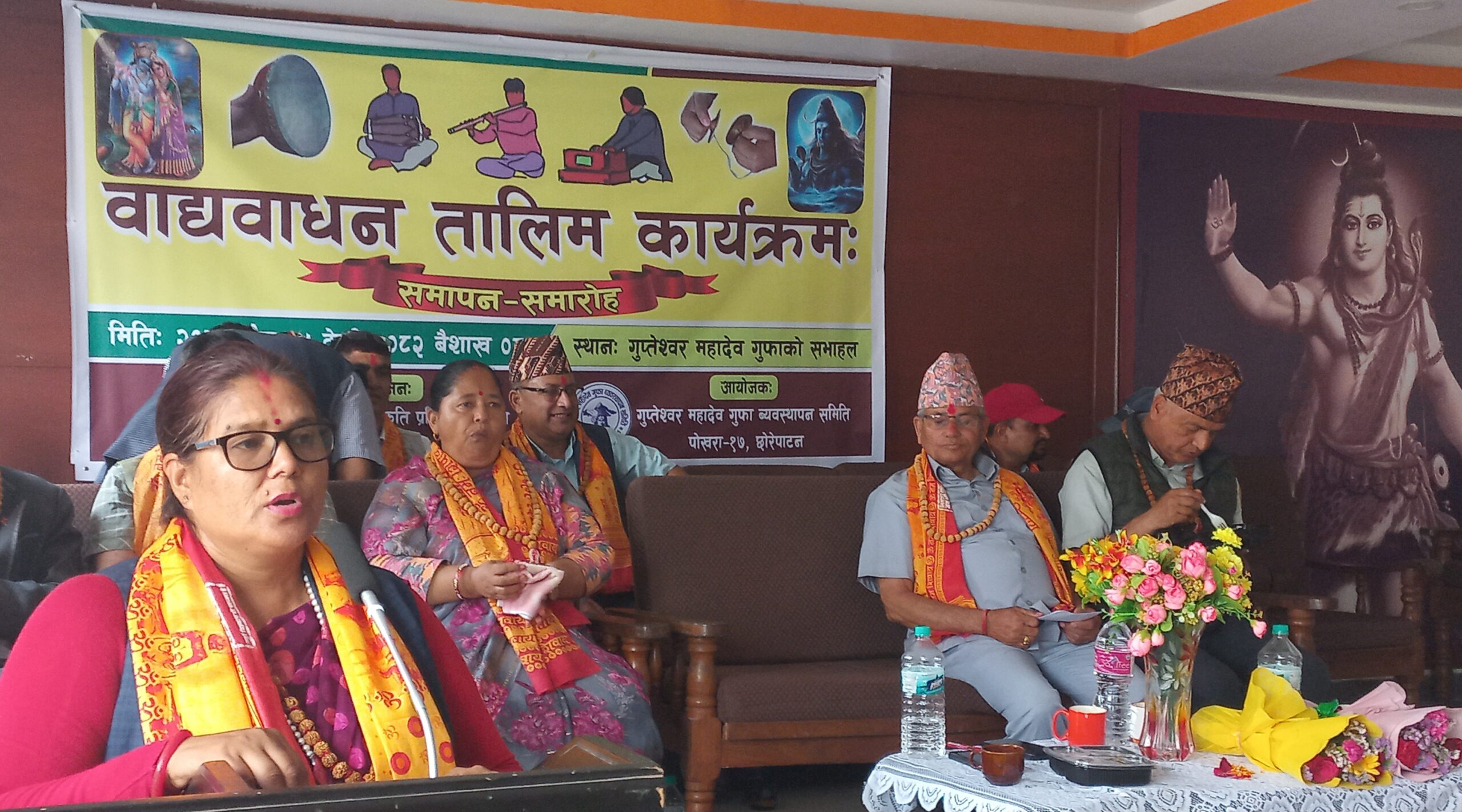 बैशाख, १० गते ।गुप्तेश्वर गुफा व्यवस्थापन समितिको आयोजना एवम् वालन तथा कला संस्कृतिक प्रतिष्ठान नेपालको संयोजनमा आयोजित एक महिने वाद्यवादन तालिम आज सम्पन्न भएको छ ।