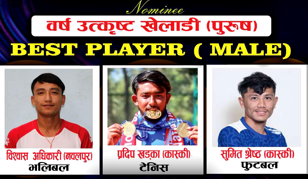 यही वैशाख २६ गते शुक्रबार पोखरा इभेन्ट सेन्टरमा हुने अवार्डका लागि ४ विधामा उत्कृष्ट तीन खेलाडीको मनोनयन सार्वजनिक भइसकेको छ । यसमध्ये वर्ष उत्कृष्ट पुरुष खेलाडीतर्फको विधामा टेनिसका प्रदीप खड्का, फुटबलका सुमित श्रेष्ठ र भलिबलका विश्वास अधिकारी उत्कृष्ट तीनमा परेका छन् । तीन मध्ये उत्कृष्ट हुने एक खेलाडीले वैशाख २६ गते टेल्जीको इलेक्ट्रिक स्कुटर प्राप्त गर्नेछन् ।