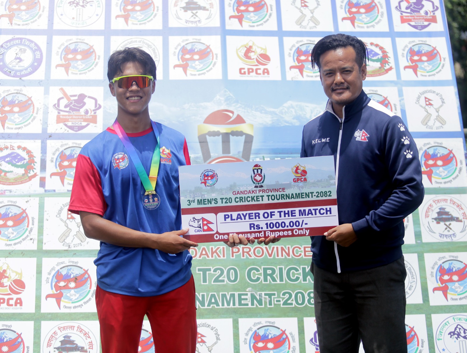 पोखरा रंगशालास्थित क्रिकेट खेल मैदानमा जारी प्रतियोगिता दुई समूहमा विभाजनमा गरि सञ्चालन भएको छ । समूह ‘ए’ मा स्याङजा, बाग्लुङ, तनहुँ र म्याग्दी रहँदा समूह ‘बी’ मा कास्की, नवलपुर, पर्वत र गोरखा रहेका छन् । प्रत्येक दिन दुई खेल हुने गरी तालिका तय गरिएको संघका अध्यक्ष सञ्जयकान्त सिग्देलले जानकारी दिए ।प्रतियोगिताको विजेता टिमले नगद रु १ लाख, उपविजेताले रु ५० हजार, ट्रफी, मेडल र प्रमाणपत्र प्राप्त गर्नेछ । त्यस्तै, उत्कृष्ट खेलाडीलाई रु ४ हजार, उत्कृष्ट ब्याटर, बलर र उदियमान खेलाडीलाई जनही रु २ हजारसहित ट्रफी प्रदान गरिनेछ । हरेक खेलको ‘प्लेयर अफ द म्याच’ ले रु १ हजार नगद र ट्रफी प्राप्त गर्ने प्रतियोगिताका संयोजक ऋषीराम गौतमले बताए ।