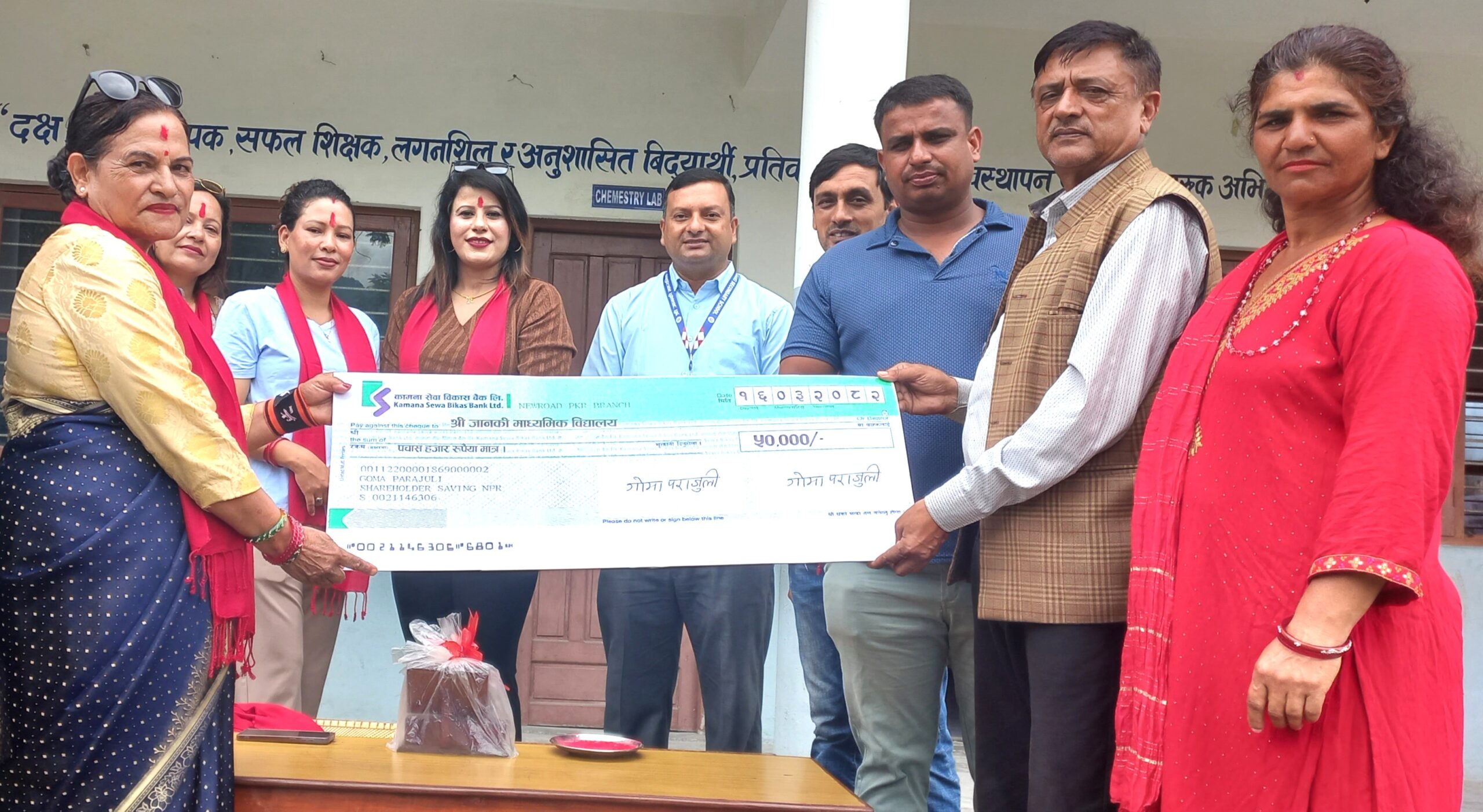 गोमा फाउण्डेशनका अध्यक्ष समेत रहनु भएका उहाँले उक्त रकम बरावरको चेक विद्यालय व्यवस्थापन समितिका सदस्य हरिप्रसाद बास्तोला, शिक्षक अभिभावक संघका अध्यक्ष विक्रमबाबु भण्डारी, प्रधानाध्यापक अर्जुन कडेललाई सामुहिकरुपमा हस्तान्तरण गर्नुभएको हो ।