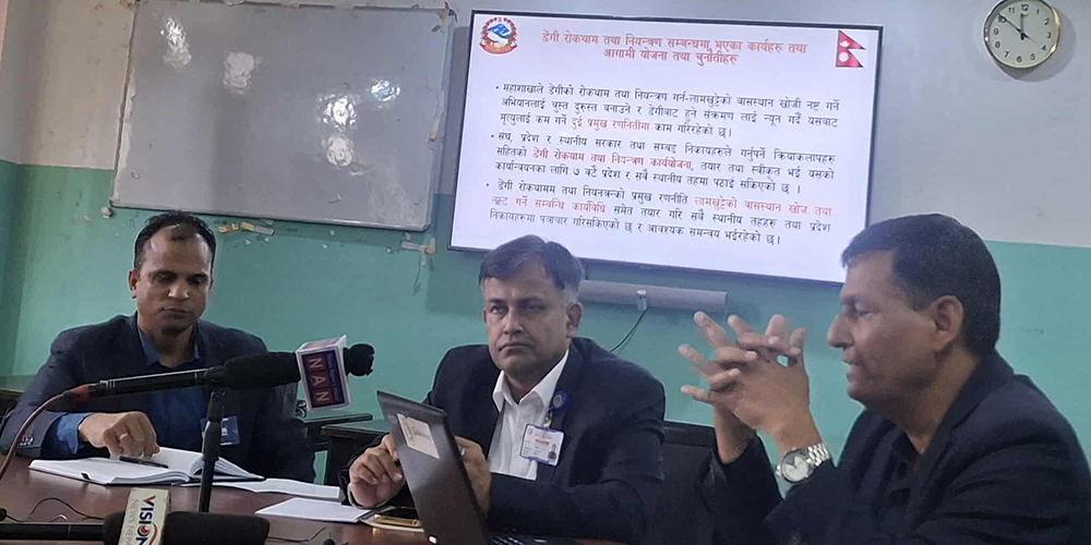 डेङ्गु फैलने समय आएकोले जति बेला पनि जुनसुकै ठाउँमा डेङ्गु सङ्क्रमण तीव्र गतिमा फैलिने सक्ने हुँदा सचेत रहन उहाँले आग्रह गर्नुभयो । साउनदेखि कात्तिक अन्तिमसम्म अत्यधिक मात्रमा डेङ्गु सङ्क्रमण बढ्ने उच्च जोखिम छ । उहाँका अनुसार हालसम्म ७३ जिल्लाबाट १६ सय को हारहारीमा डेङ्गु सङ्क्रमण पुष्टि भएको छ । बिरामीमा लक्षण नदेखिने, डेङ्गु परीक्षण नहुँदा, परीक्षण भए पनि रिपाेर्ट नदिने कारणले डेङ्गु सङ्क्रमणको तथ्याङ्क कम देखिएको उहाँको भनाइ छ ।